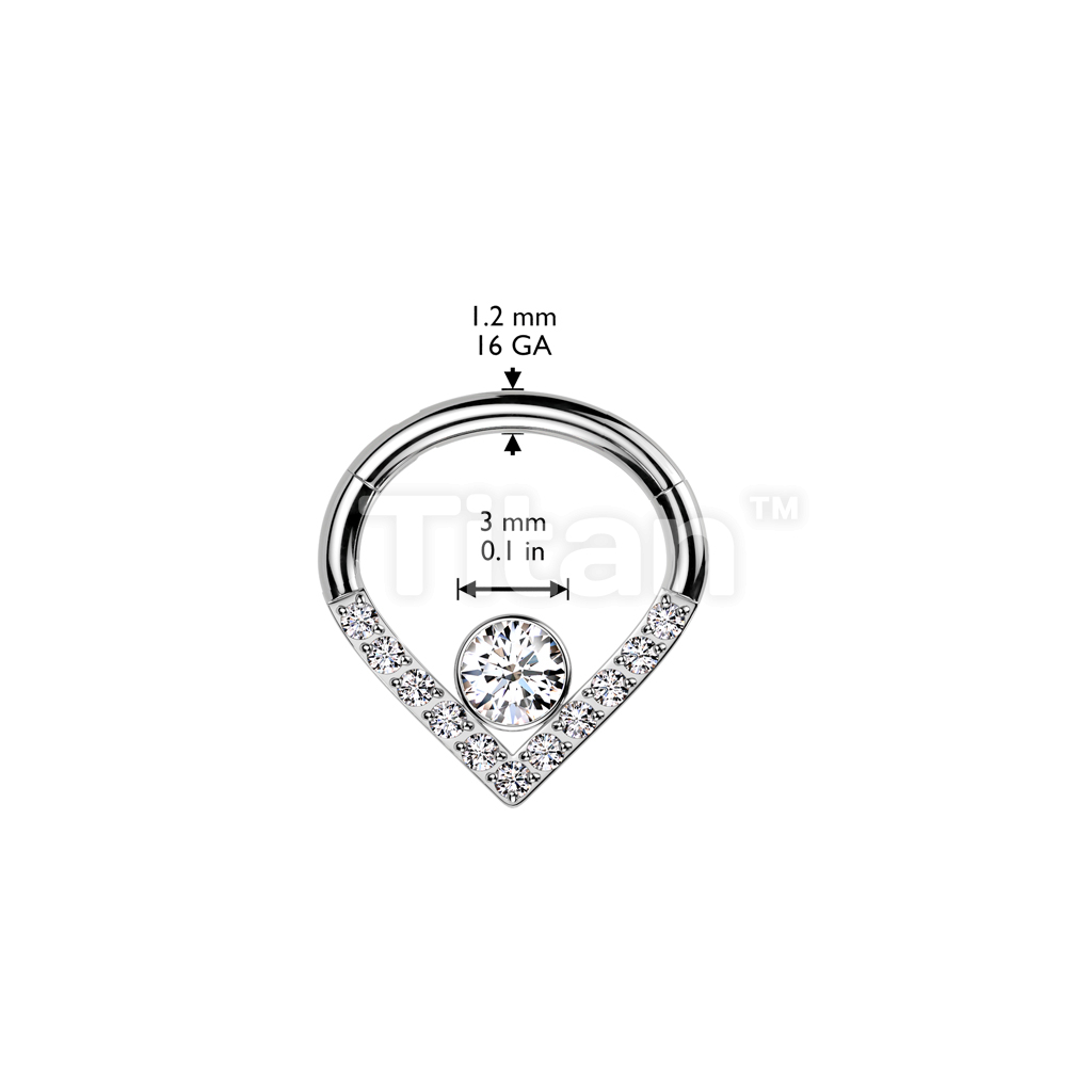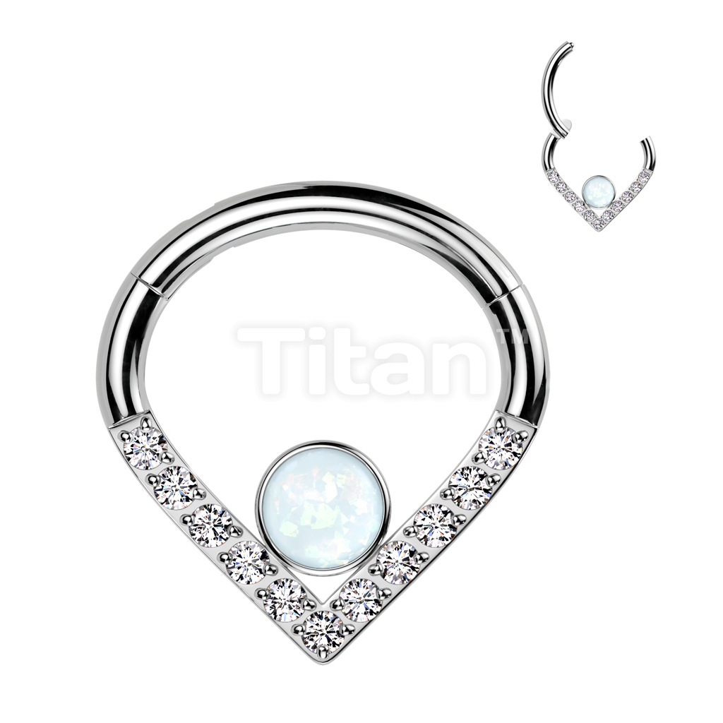 Implant Grade Titanium Hinged Segment Hoop Ring With Pave CZ Single Line Chevron and CZ or Opal Center