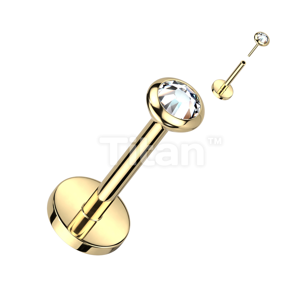 Implant Grade Titanium Threadless Push In Labret, Flat Back Stud With Round Flat Bezel Set CZ or Opal Top