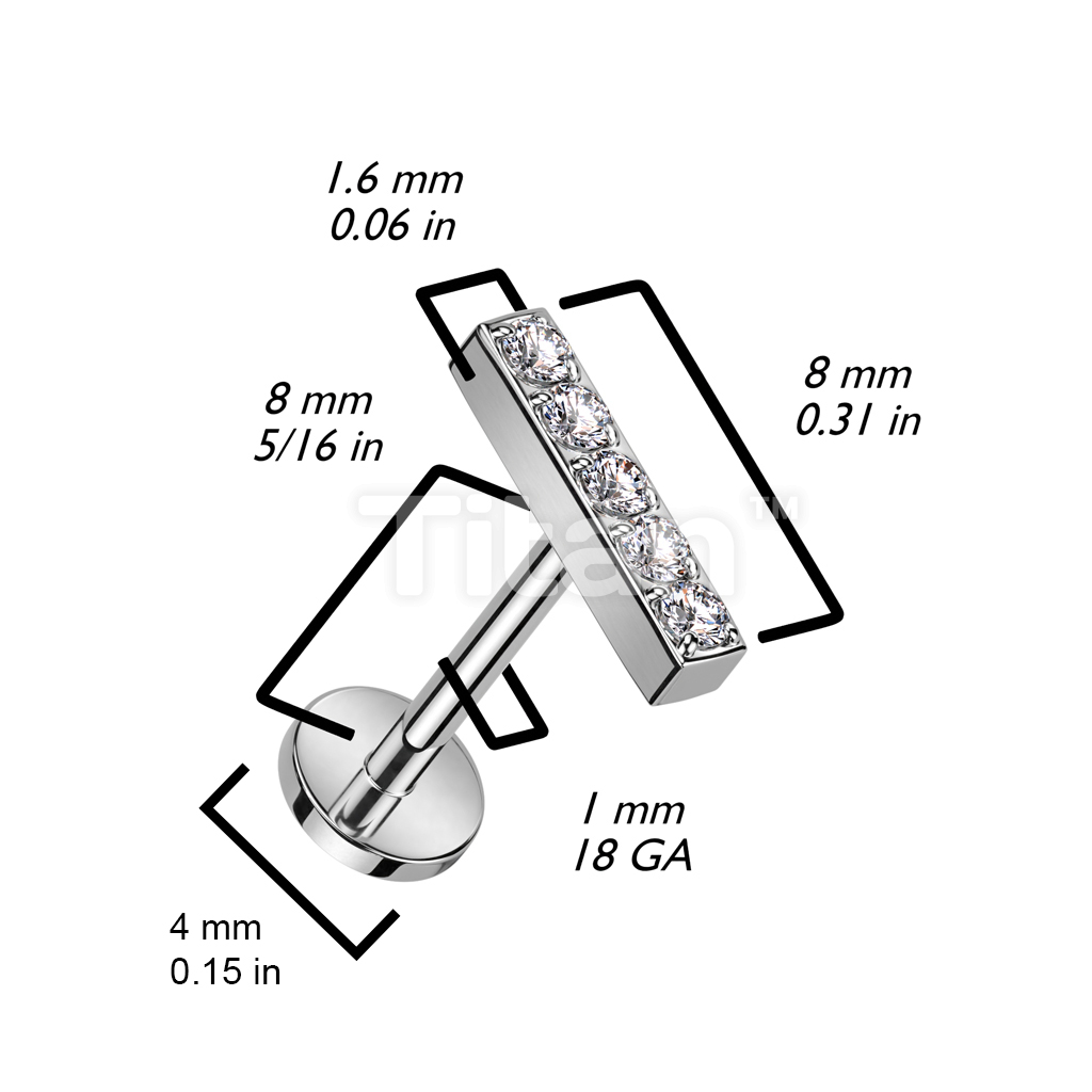 Implant Grade Titanium Threadless Push In Labret, Flat Back Stud With 5 CNC Set CZ Lined Straight Bar Top