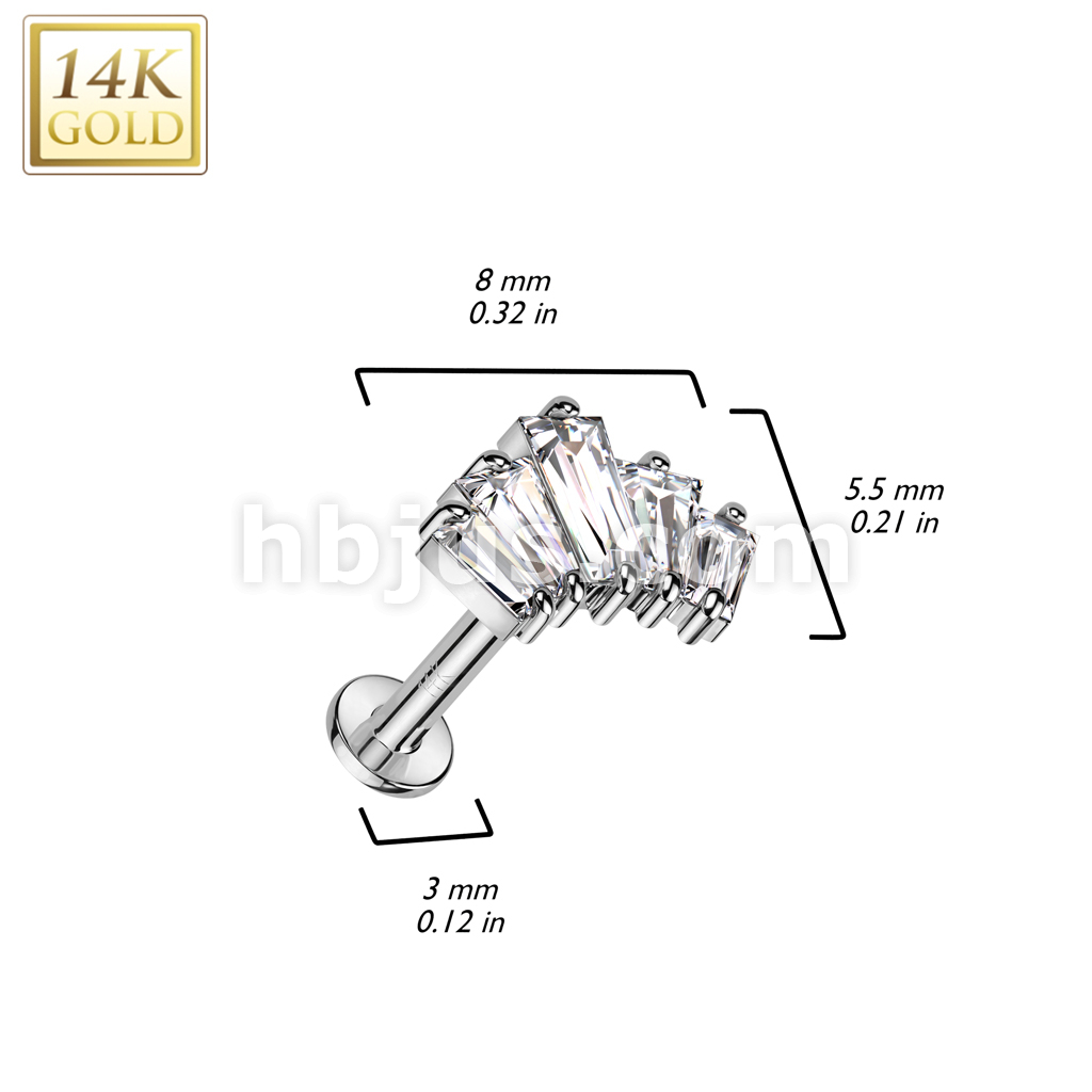 14K Gold Threadless Labret/Flat Back Stud With 5 Baguette CZ Fan Top