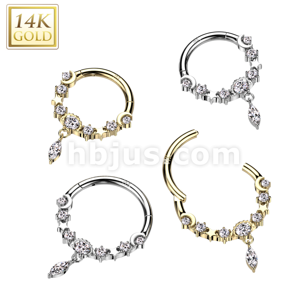 14K Gold Hinged Segment Ring With Front Facing CZ's and Marquise CZ Dangle