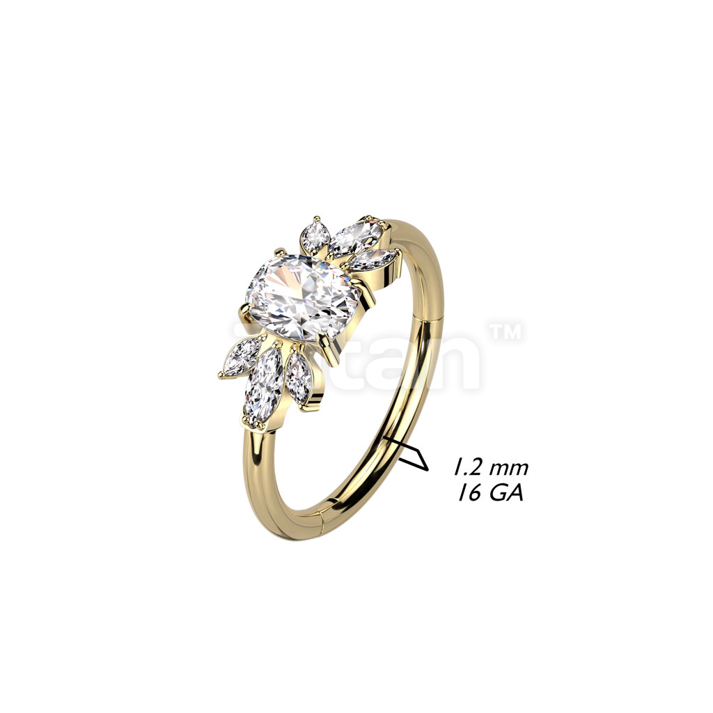 Implant Grade Titanium Hinged Segment Hoop Ring With Emerald Cut CZ Center Between Double CZ Marquise Leaf