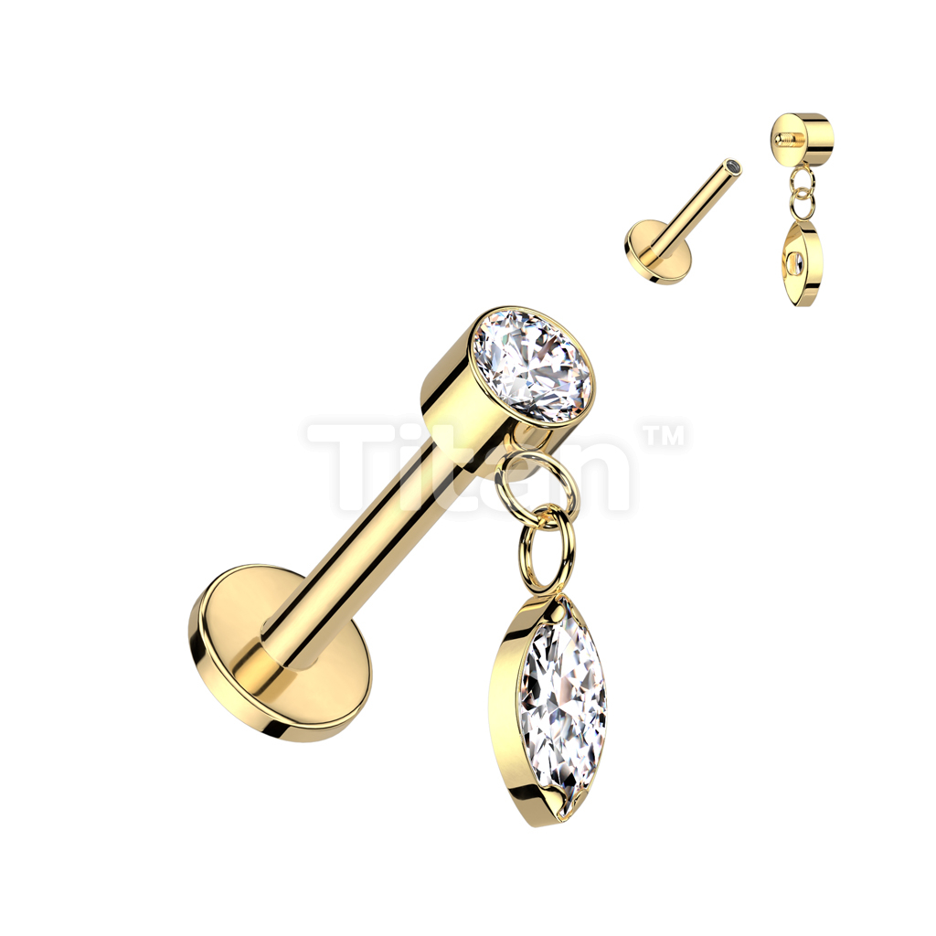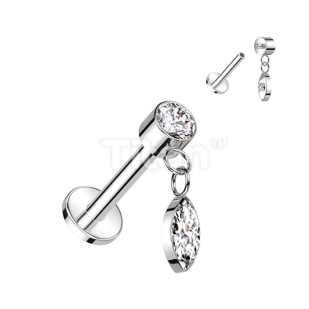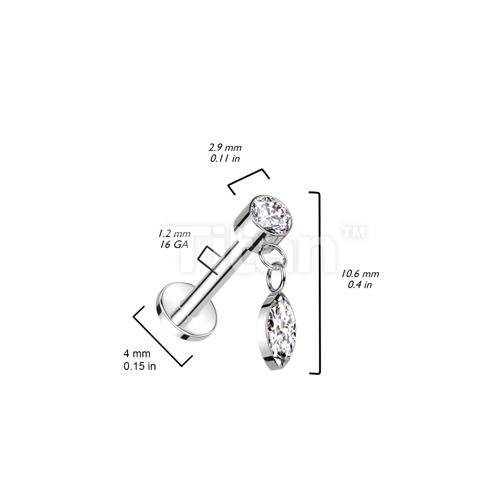 Implant Grade Titanium Internally Threaded Labret With Round Bezel Set CZ and Marquise CZ Dangle Top