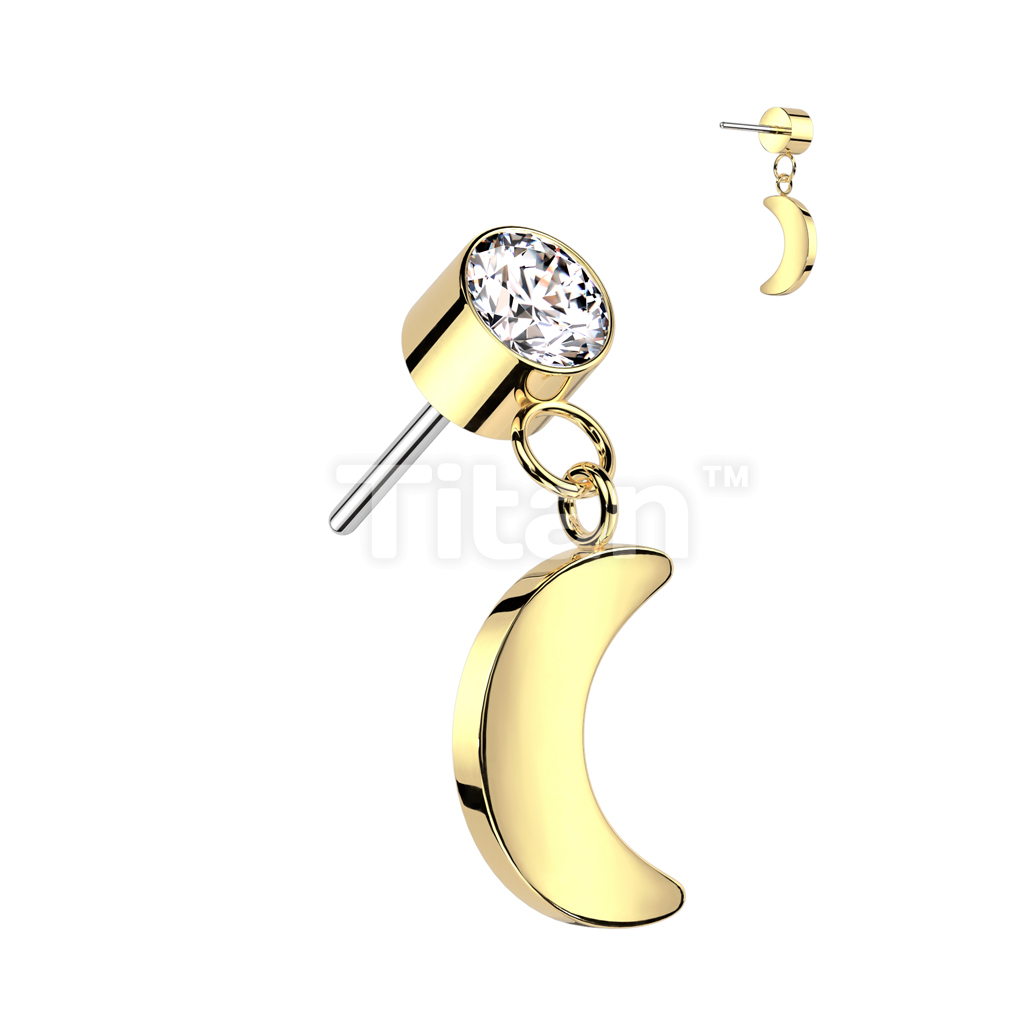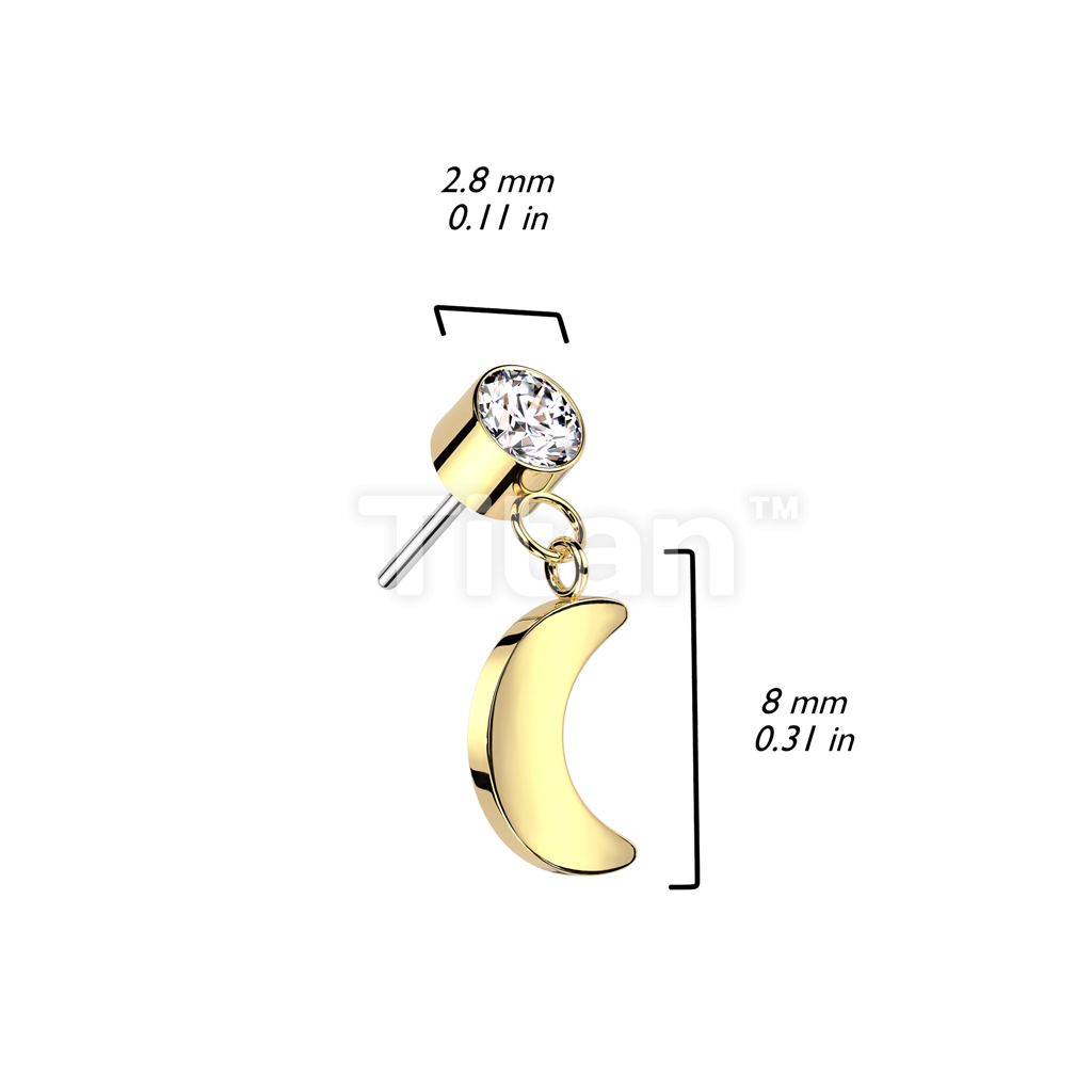 Implant Grade Titanium Threadless Push In Round Bezel Set CZ With Crescent Moon Dangle Top