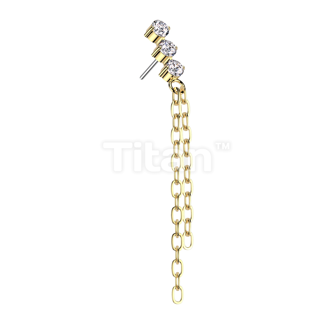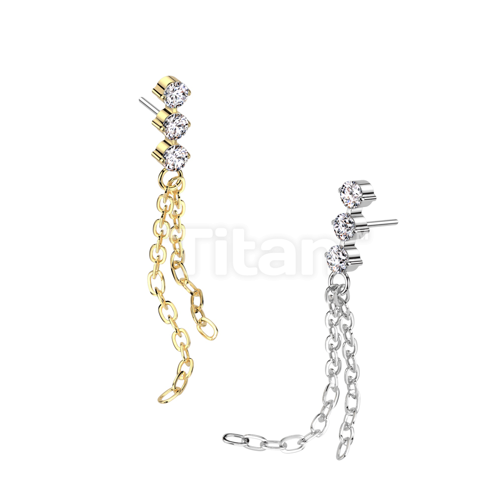 Implant Grade Titanium Threadless Push In 3 CZ Top With Double Chain Dangle