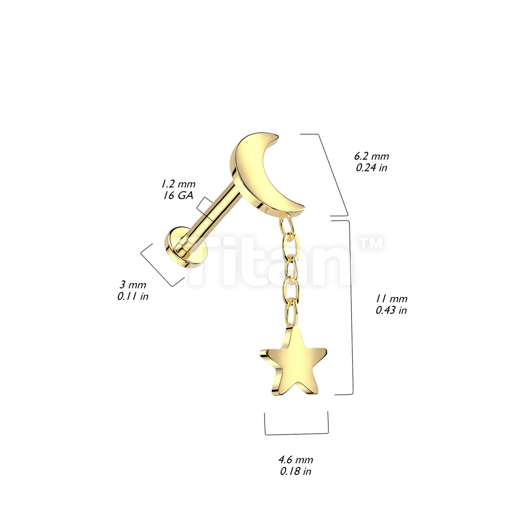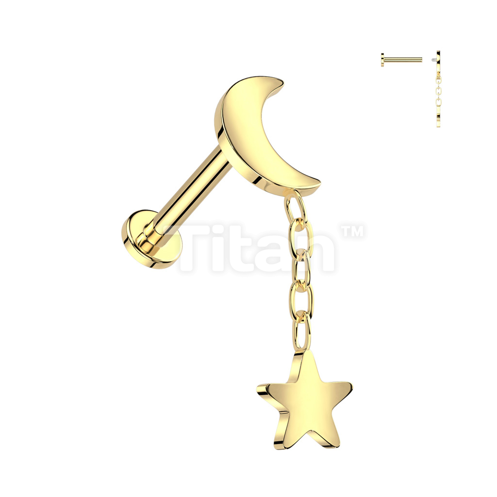 Implant Grade Titanium Internally Threaded Labret Crescent Moon With Star Dangle Top