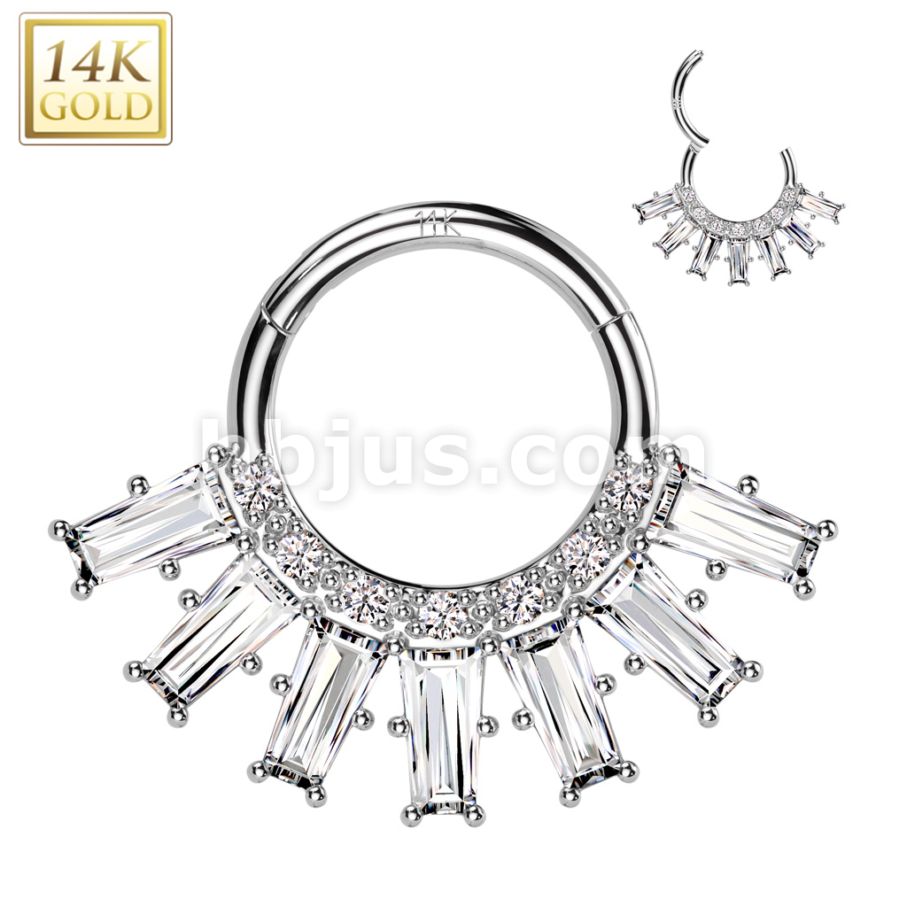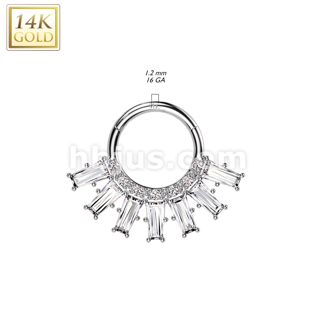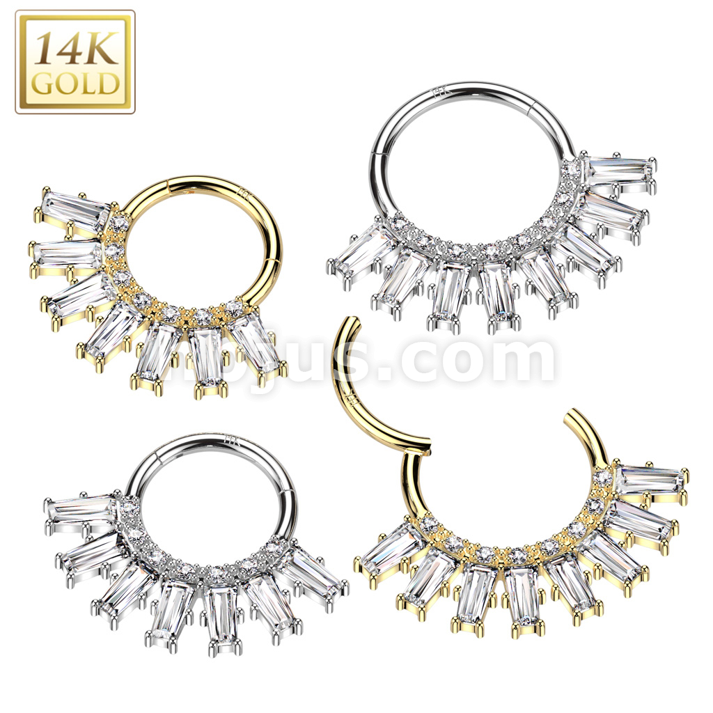 14K Gold Hinged Segment Hoop Ring With Round and Baguette CZ Fan