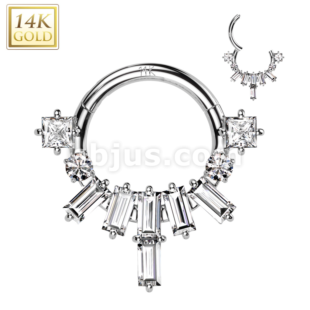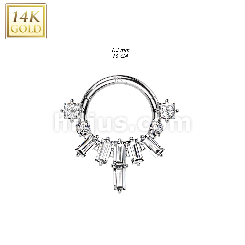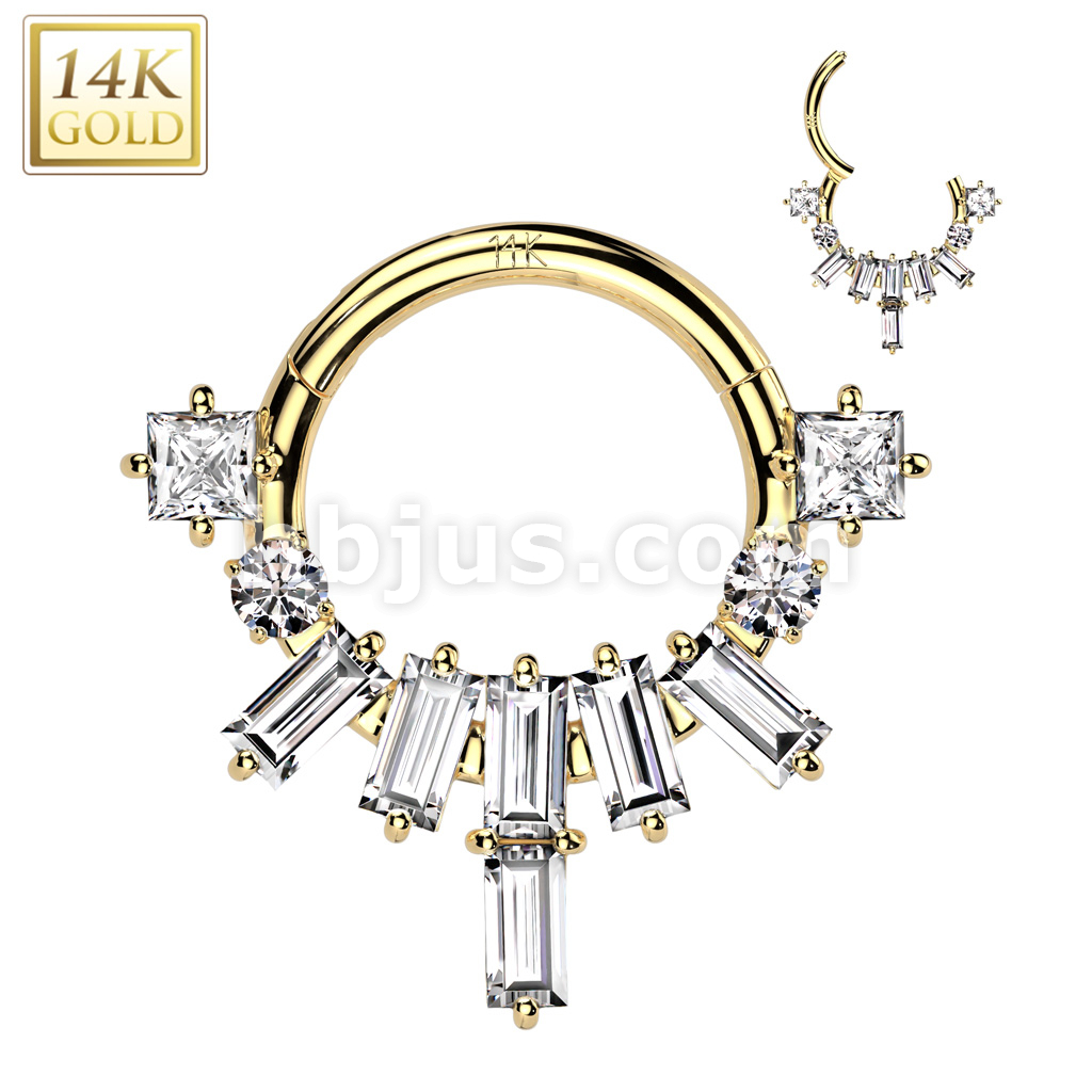 14K Gold Hinged Segment Hoop Ring With Baguette CZ Fan and Round and Princess Cut CZ on Each Side