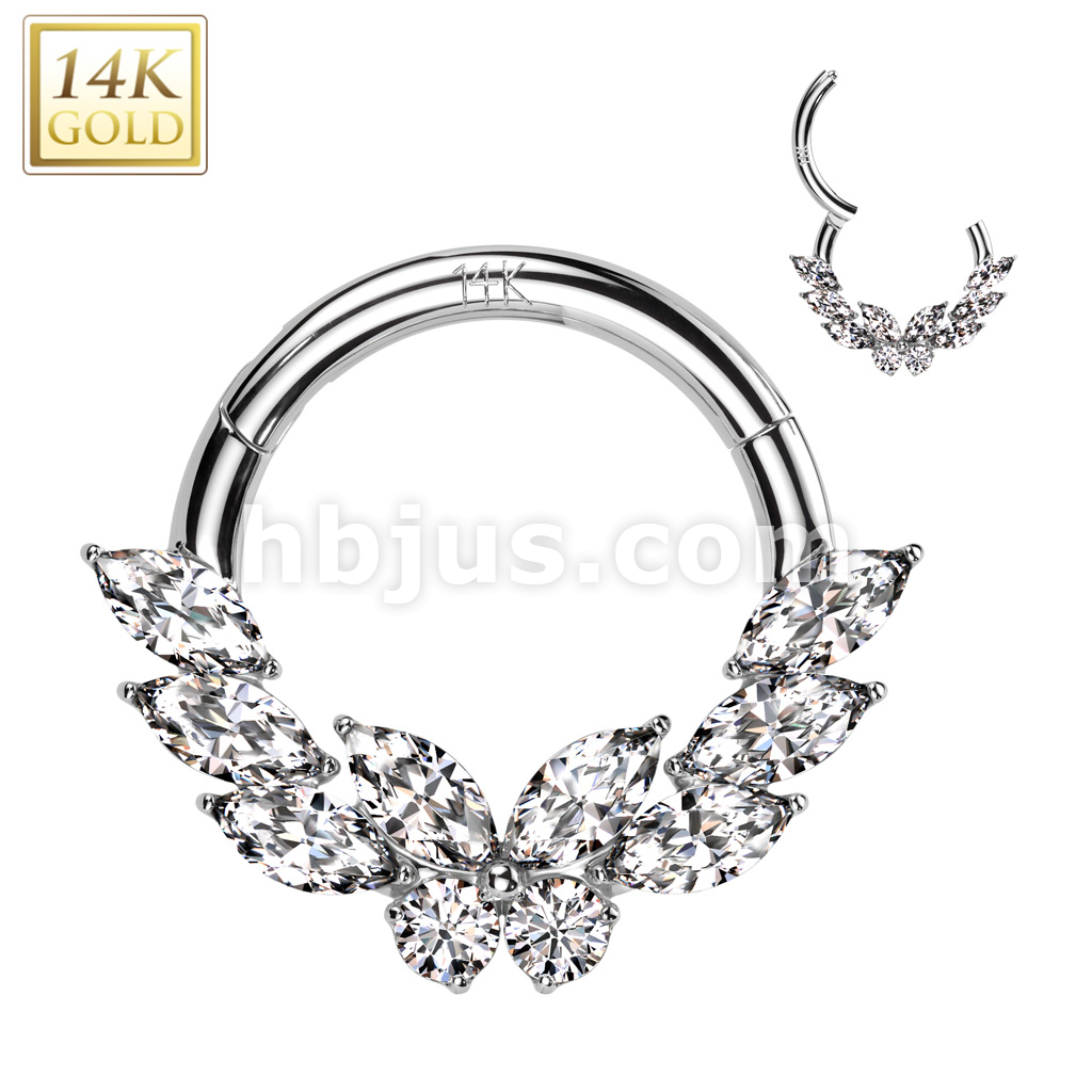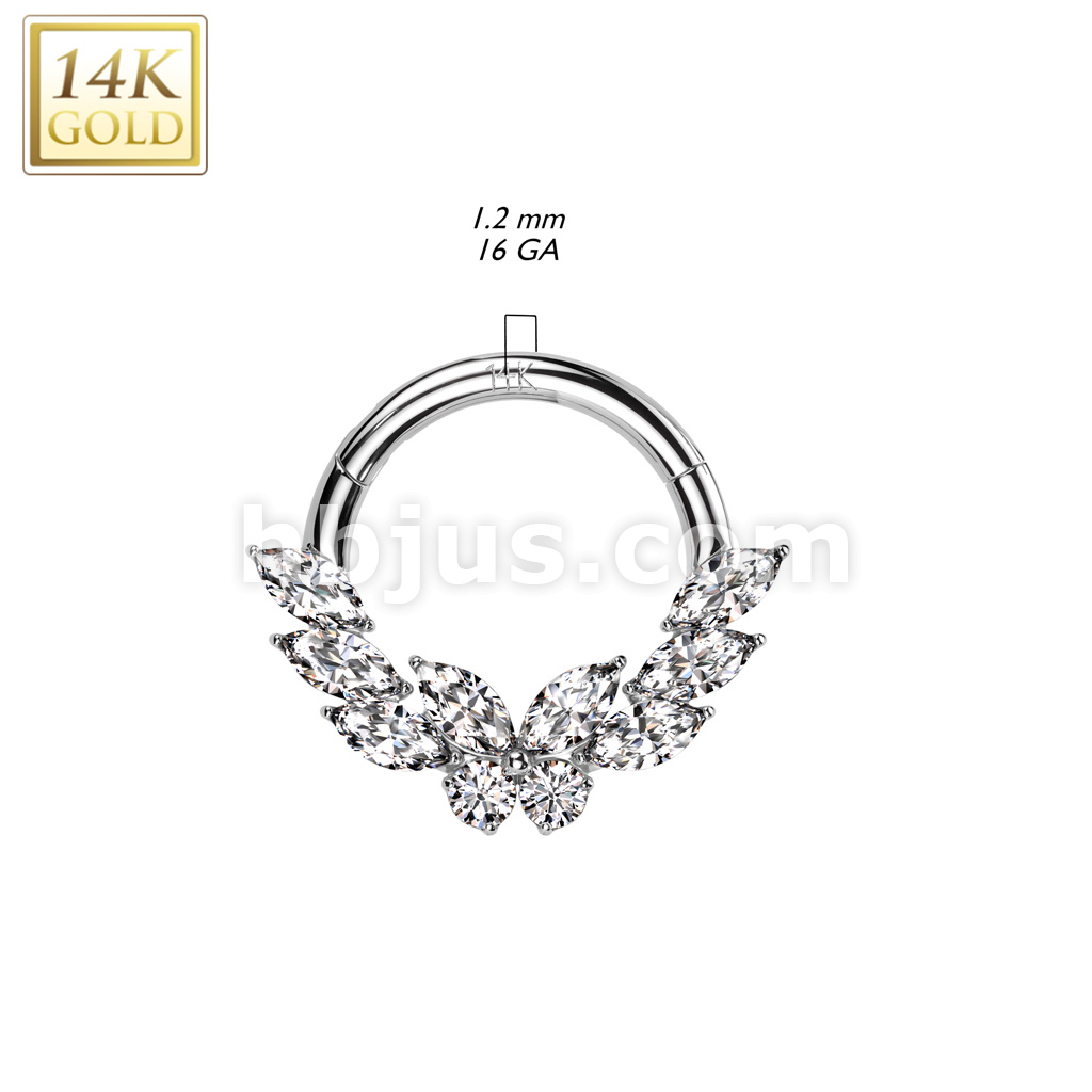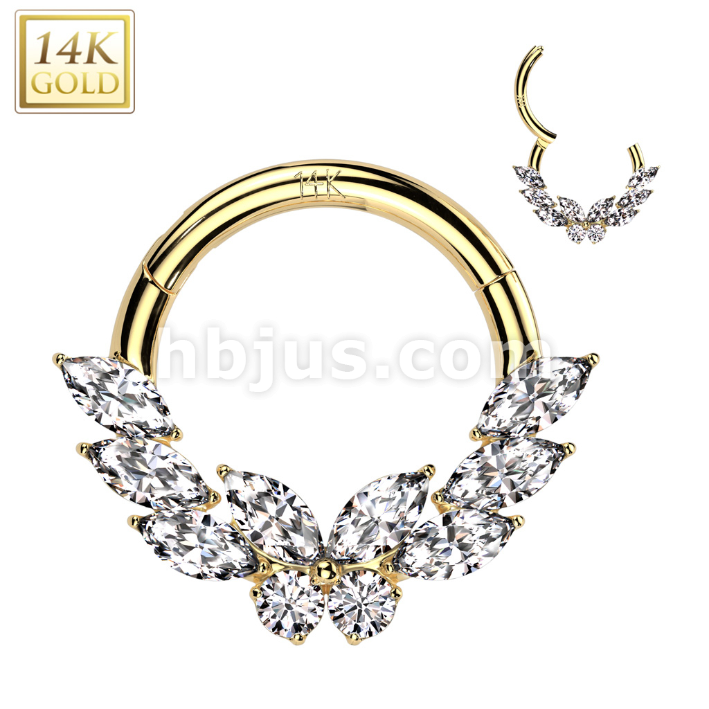 14K Gold Hinged Segment Hoop Ring With CZ Butterfly Center and 3 Marquise CZ on Each Side