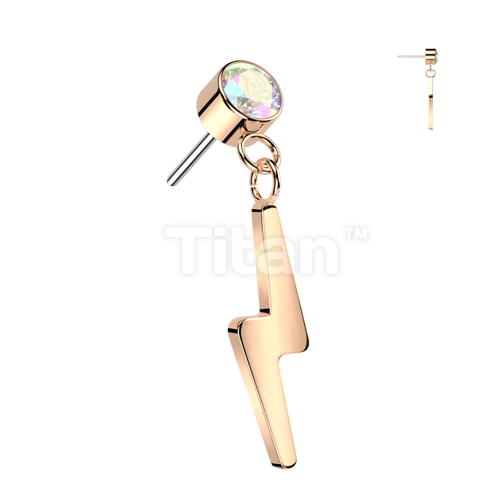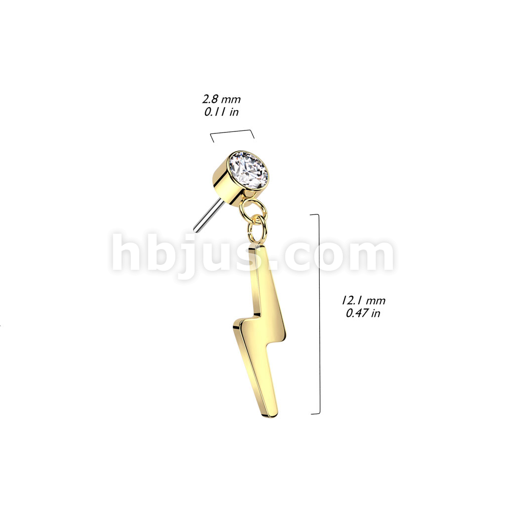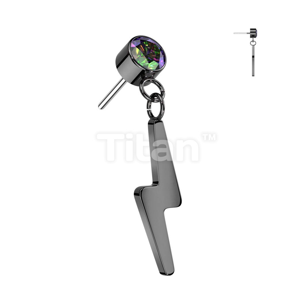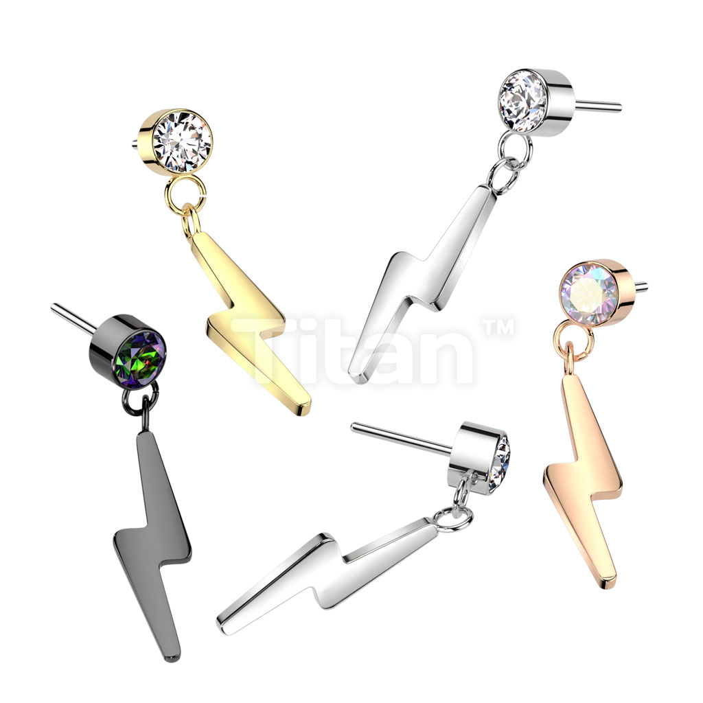 Implant Grade Titanium Threadless Push In Round Bezel Set CZ With Lightning Bolt Dangle Top