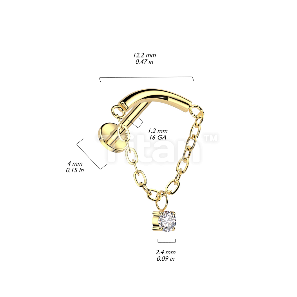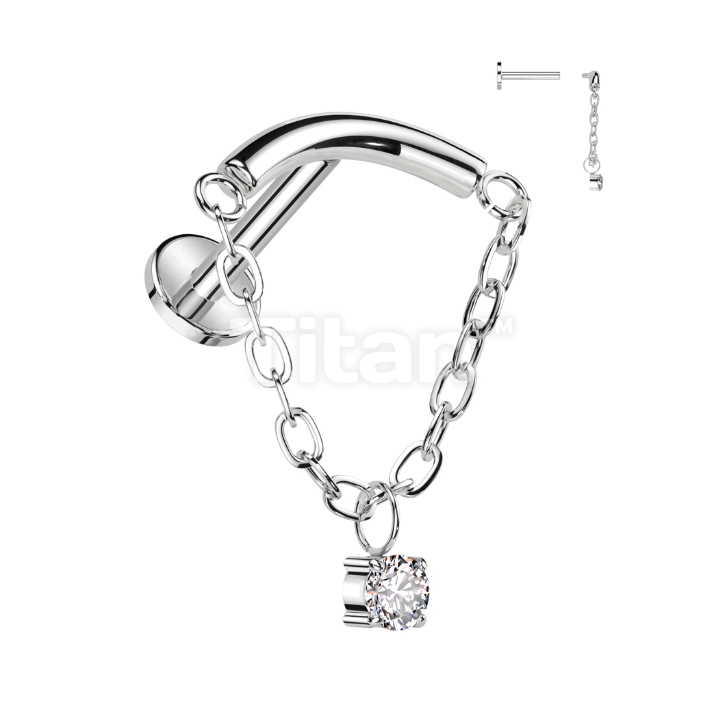 Implant Grade Titanium Internally Threaded Labret With Chain Linked Curved Bar and CZ Dangle Top