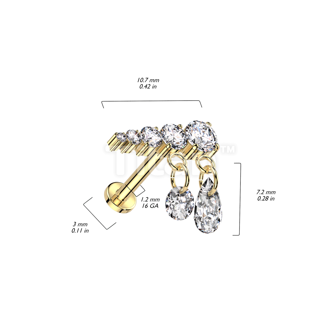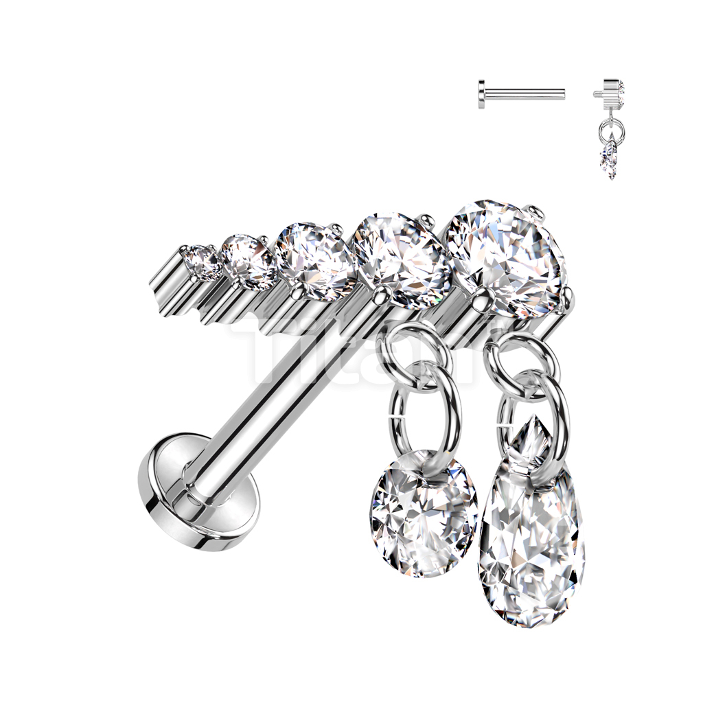 Implant Grade Titanium Internally Threaded Labret With Prong Set Descending 5 CZ Line and 2 Dangling CZ Top