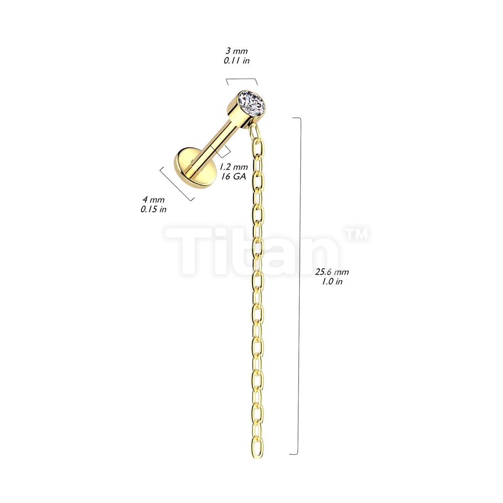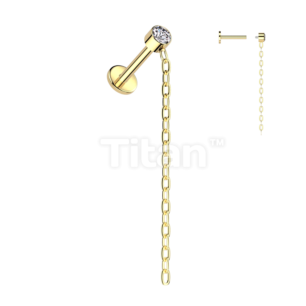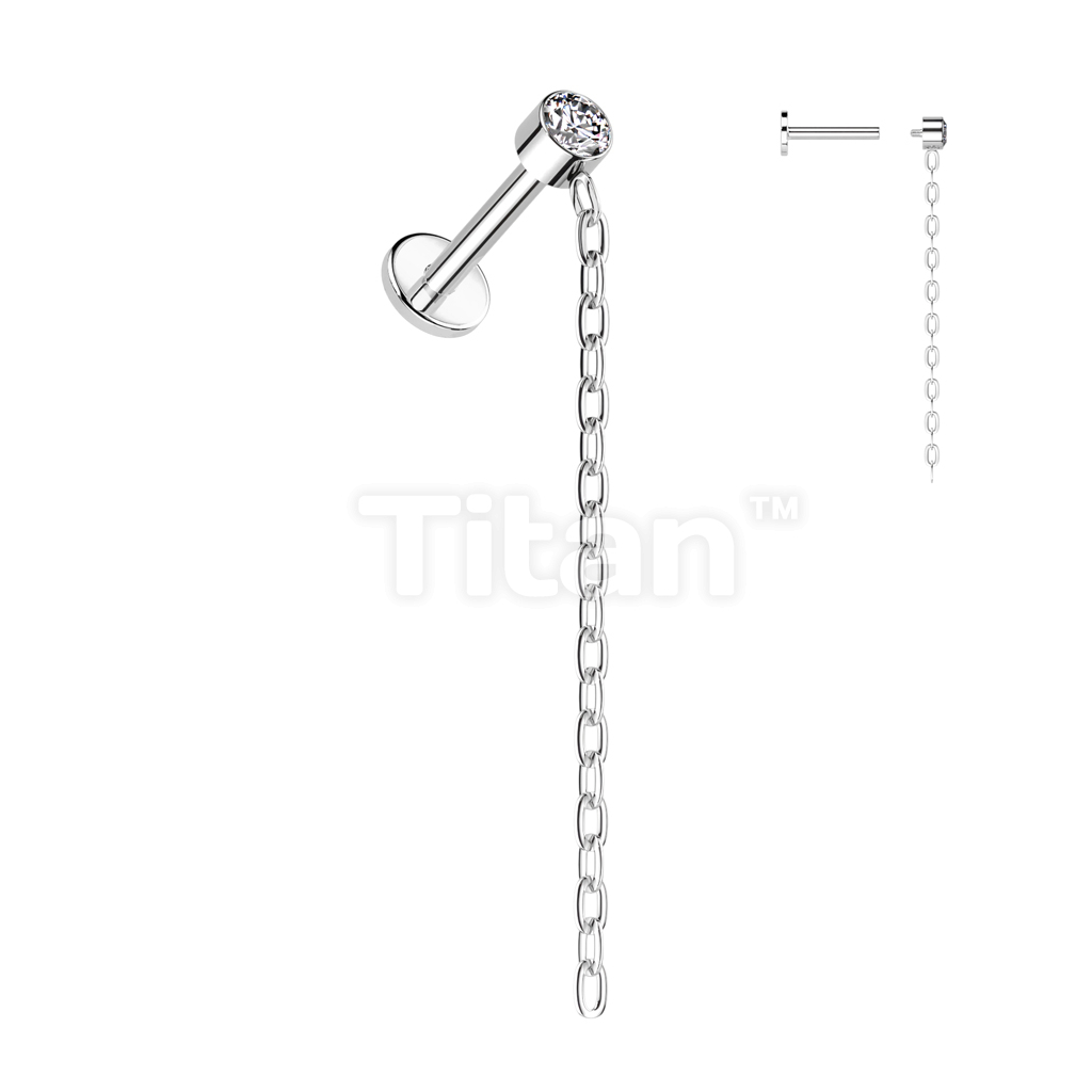 Implant Grade Titanium Internally Threaded Labret With Round Bezel Set CZ and Chain Dangle Top