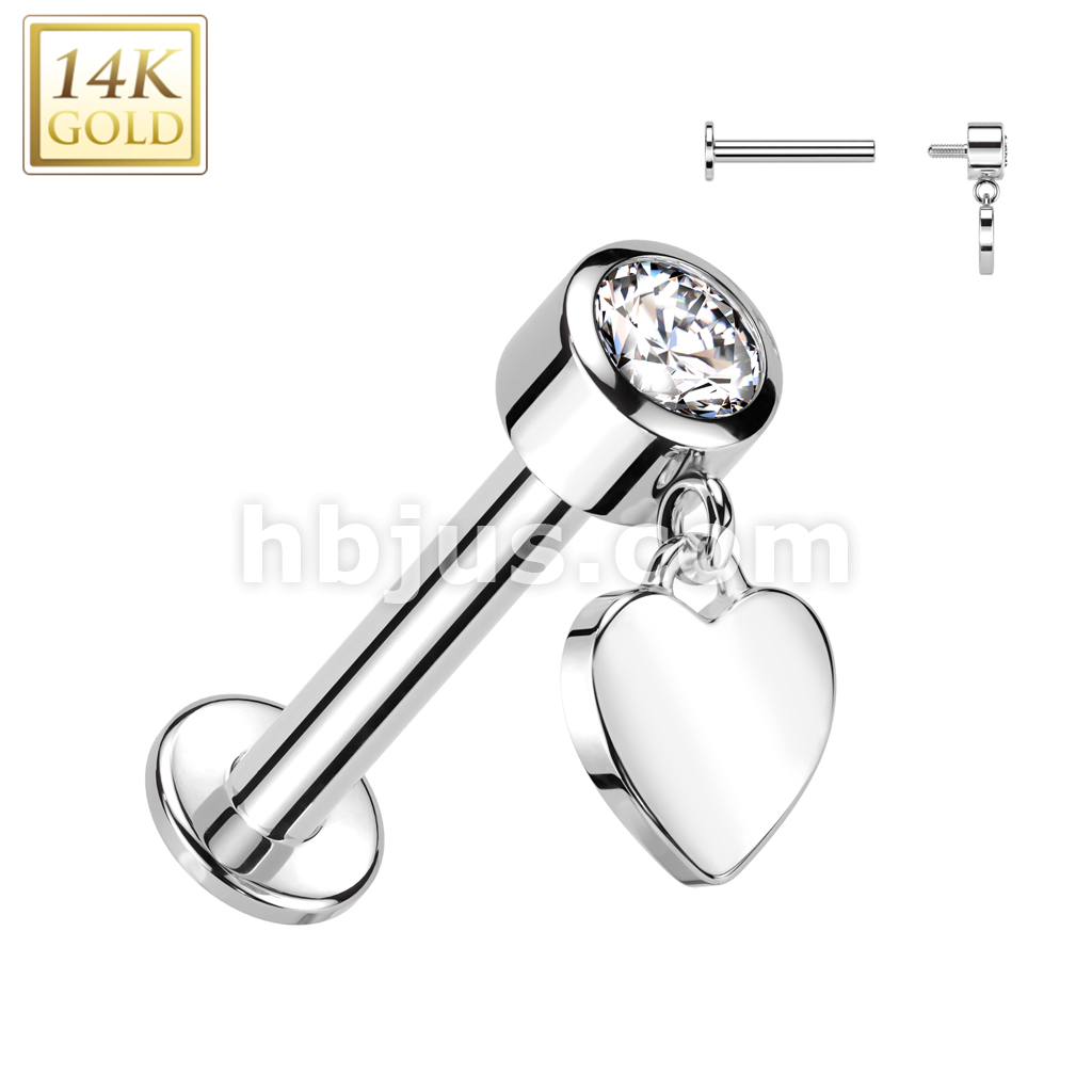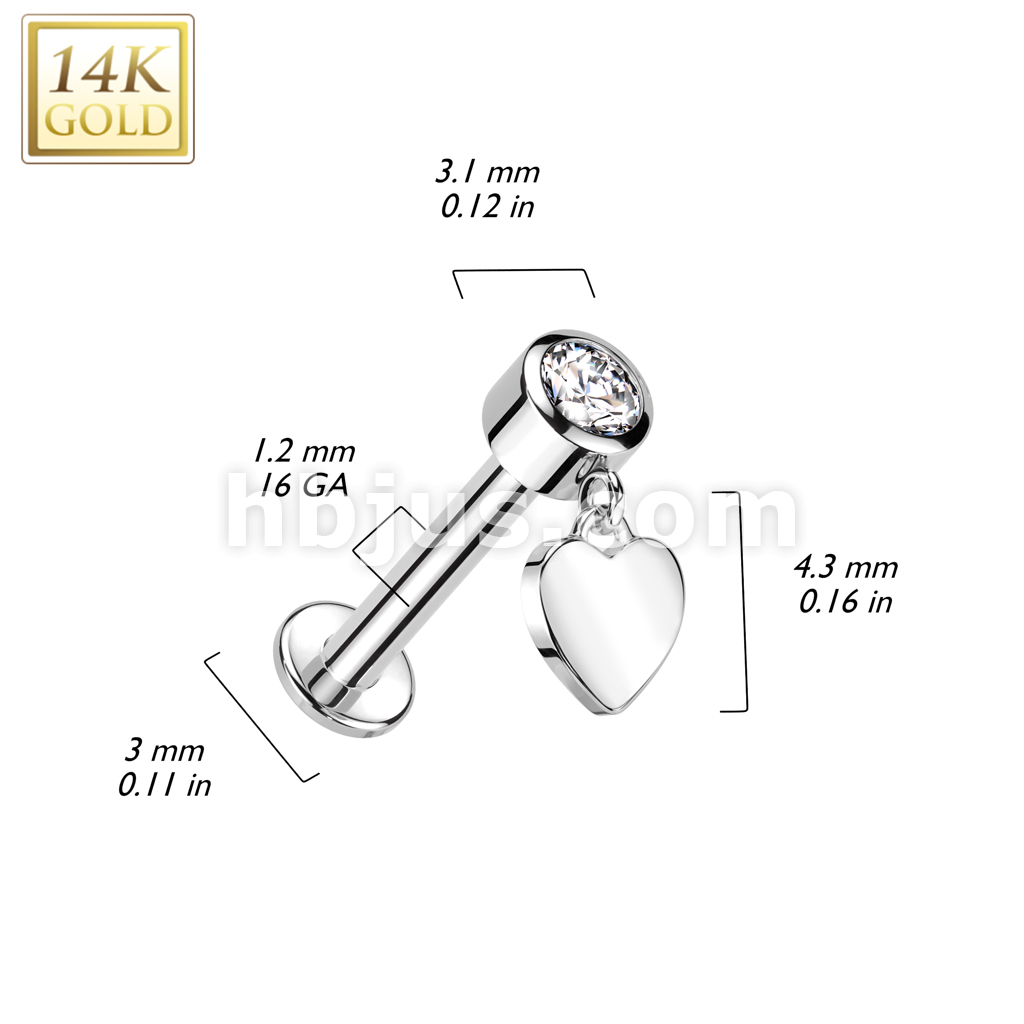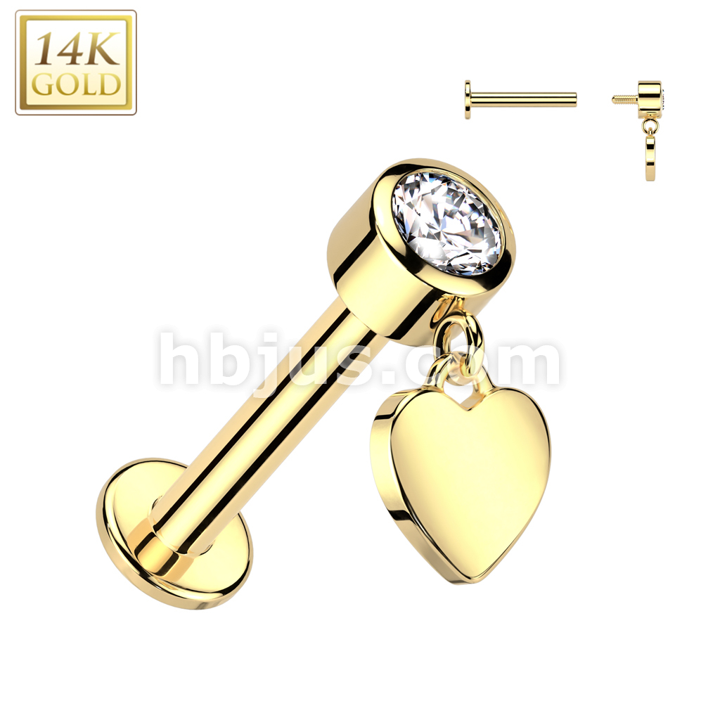 14K Gold Internally Threaded Labret With Bezel Set CZ Top and Heart Dangle