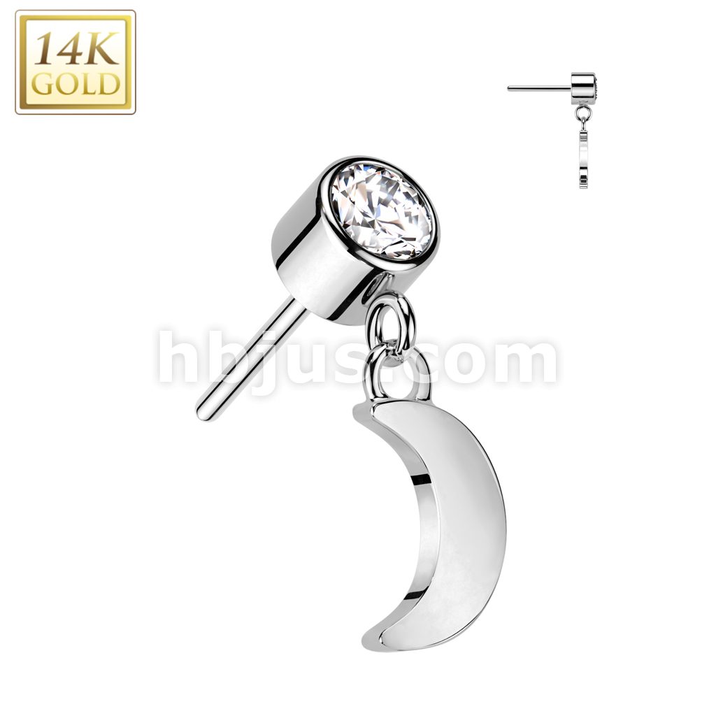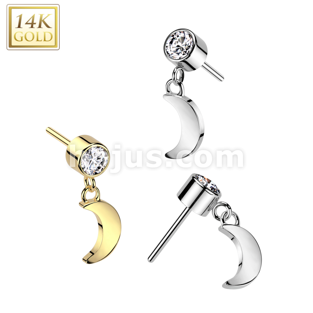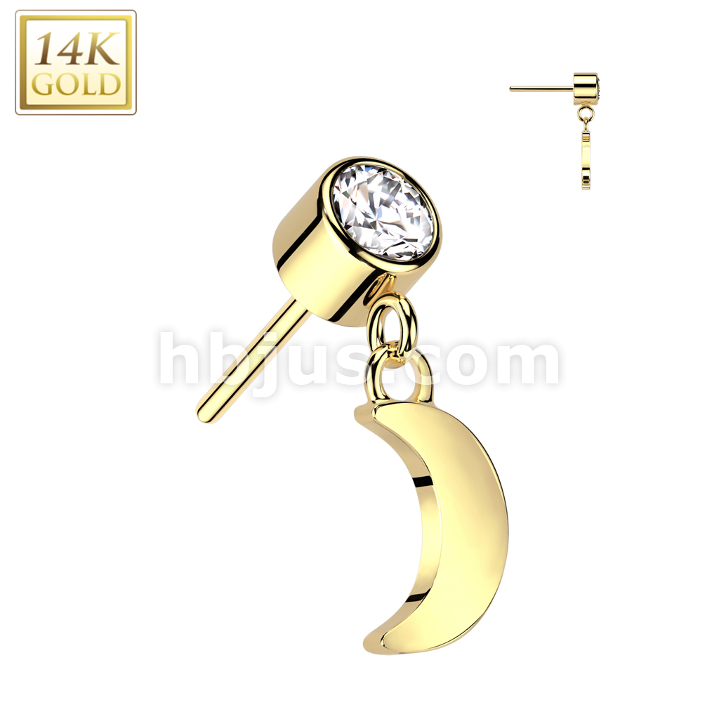 14K Gold Threadless Push In Bezel Set CZ Top With Crescent Moon Dangle