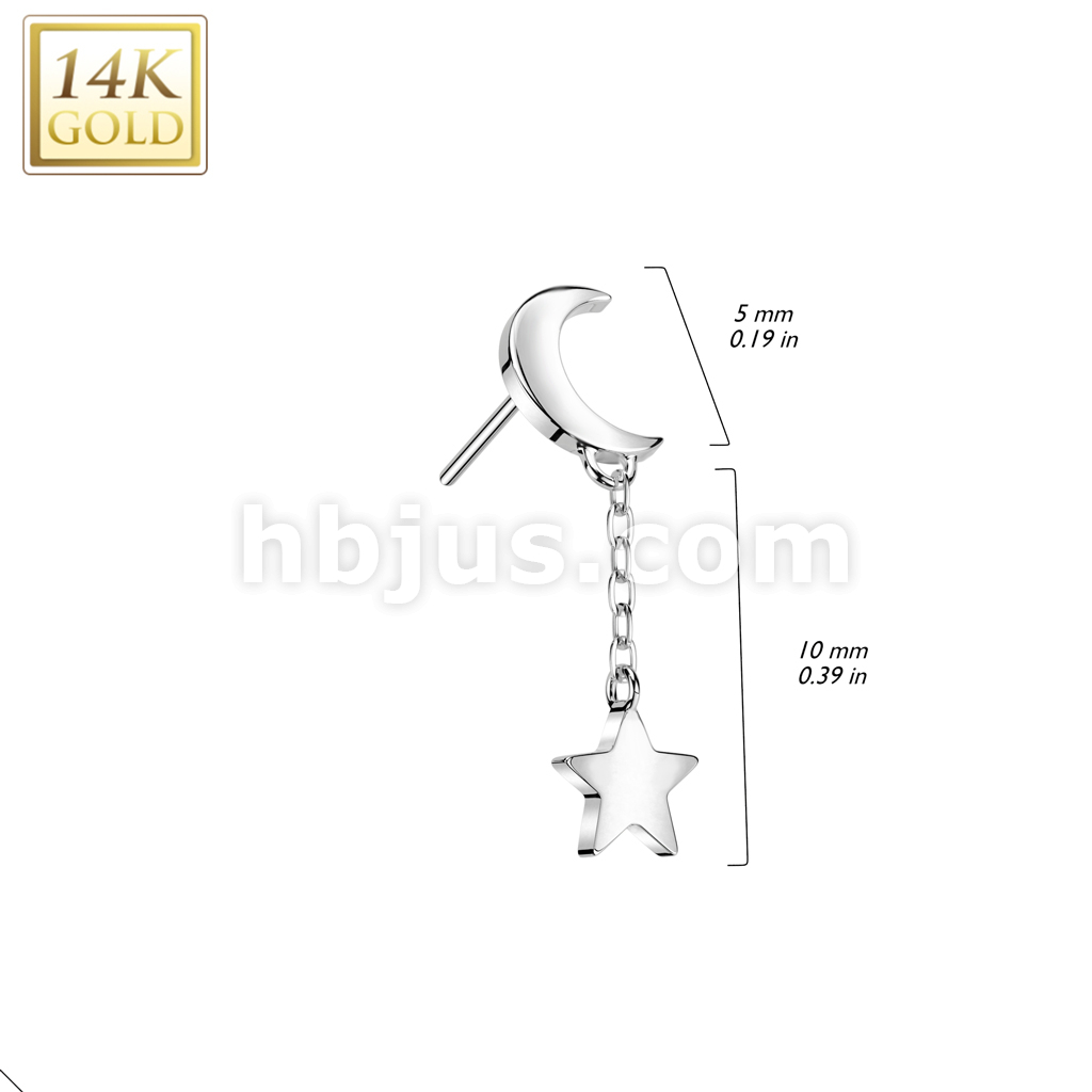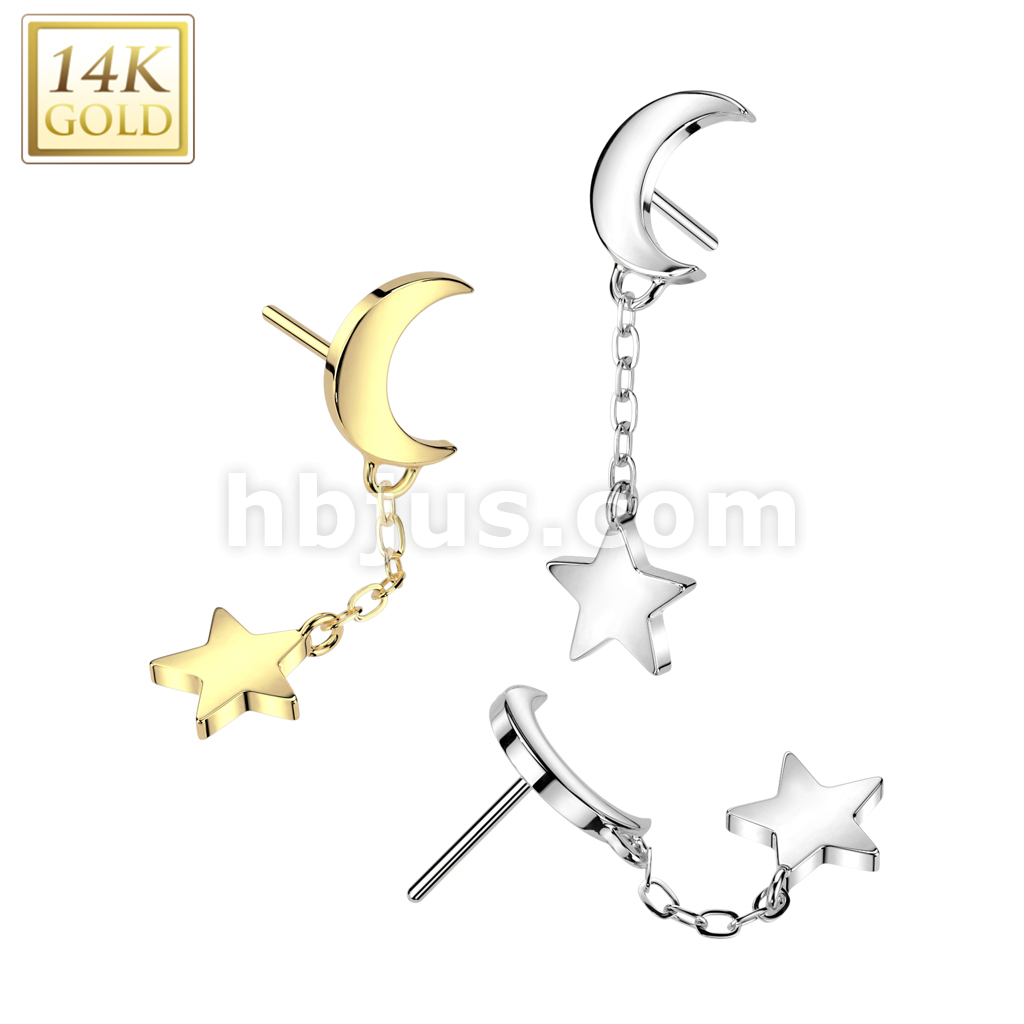 14K Gold Threadless Push In Crescent Moon Top With Star Dangle