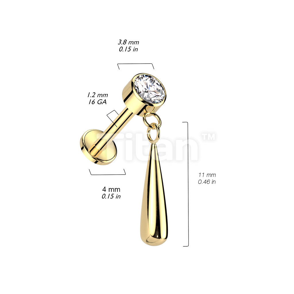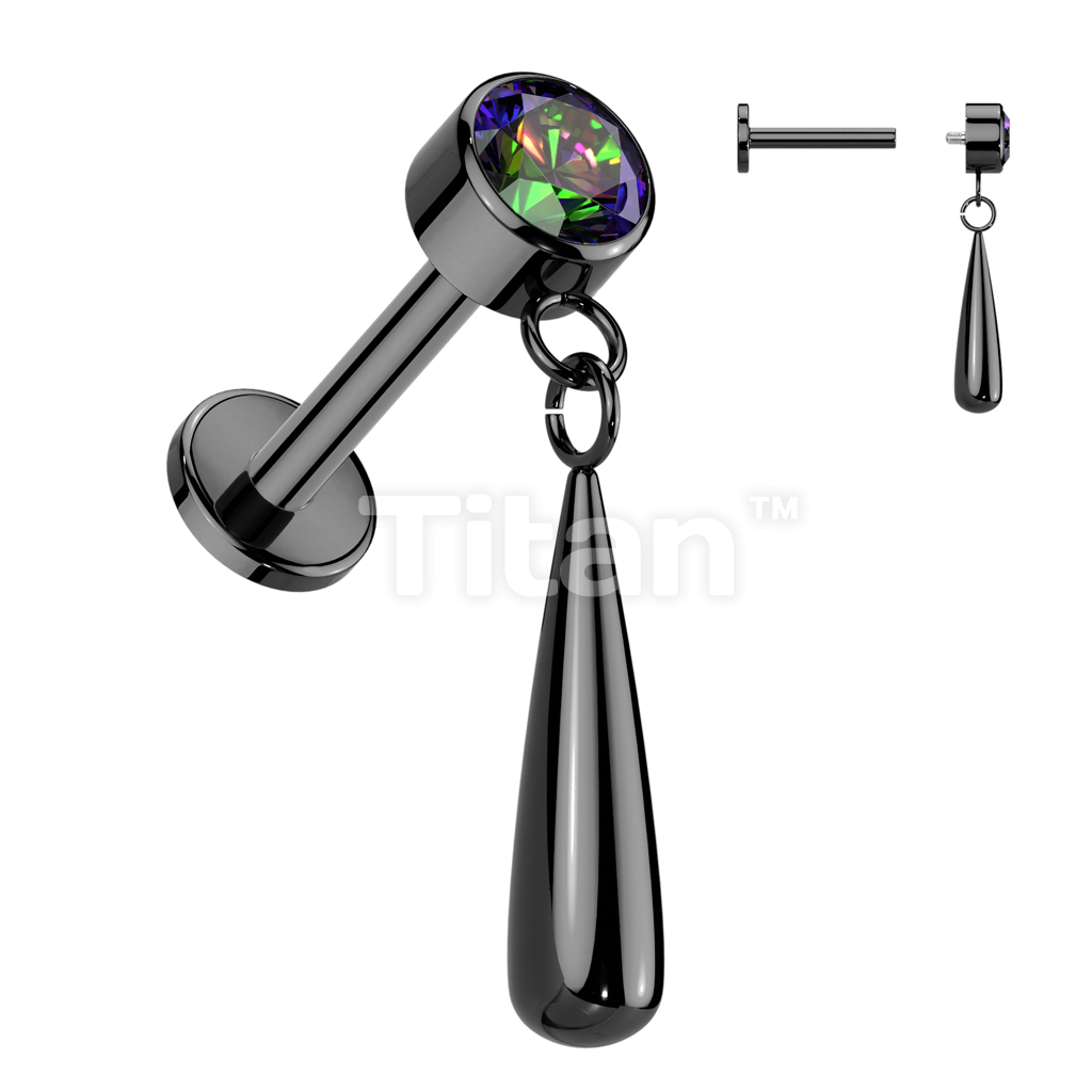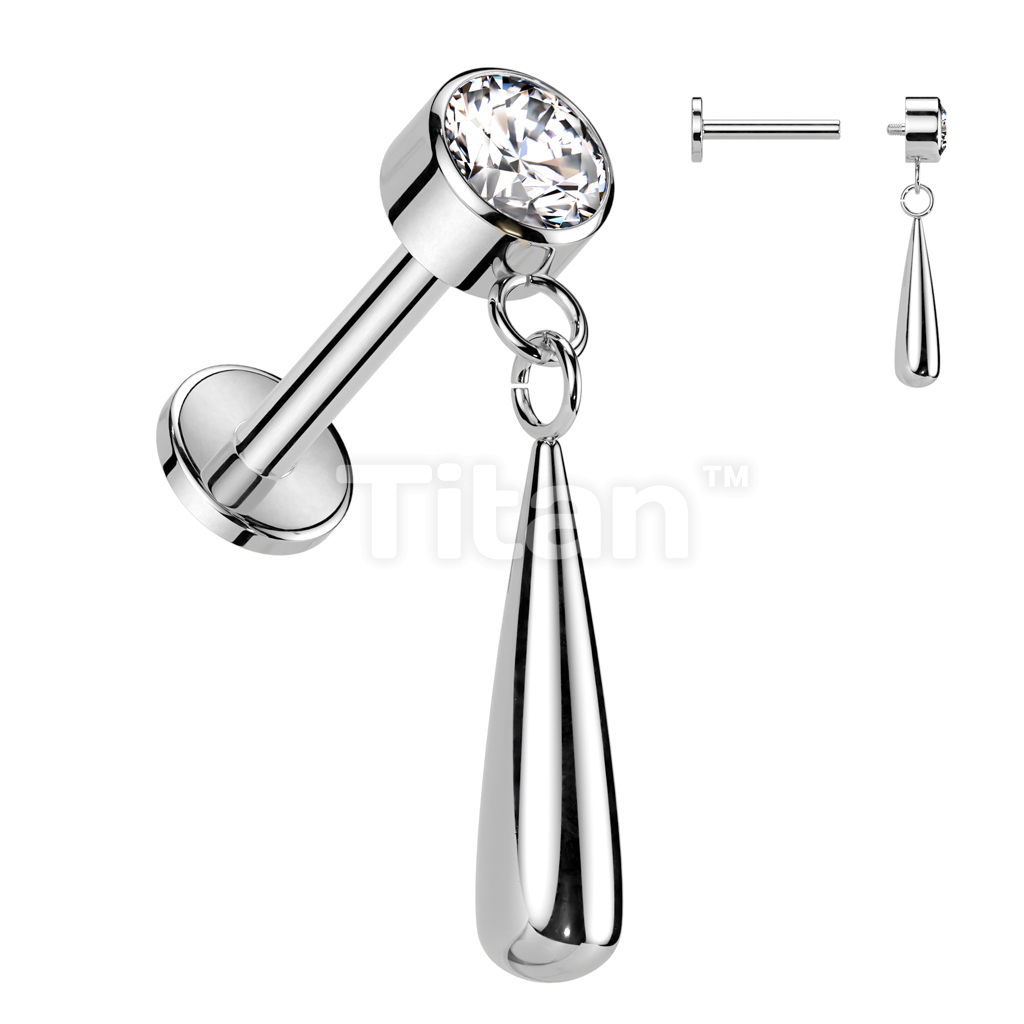 Implant Grade Titanium Internally Threaded Labret With Bezel Set CZ Top and Teardrop Dangle