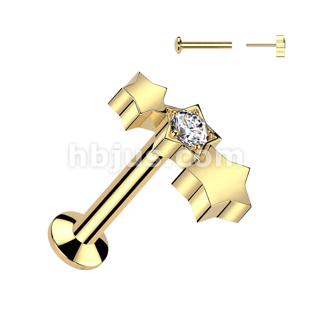 All 316L Surgical Steel Threadless Push In Labret With Convex Back and Triple Star With Round CNC Set CZ Center Top