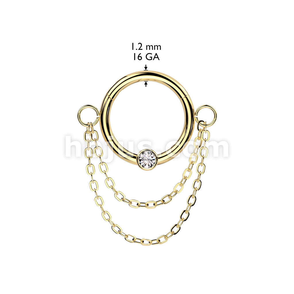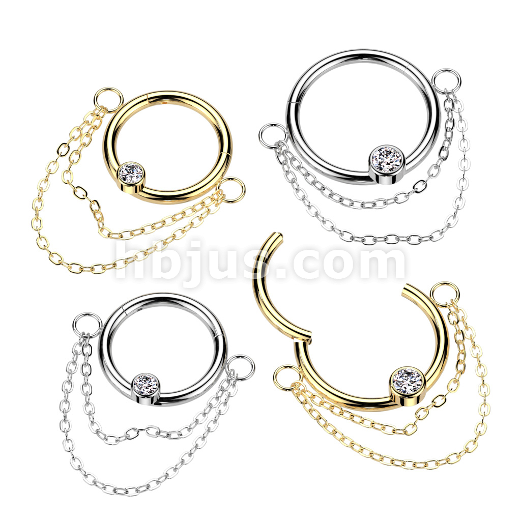 High Quality Precision All 316L Surgical Steel Hinged Segment Ring With Bezel Set CZ Center and Double Chain Dangle