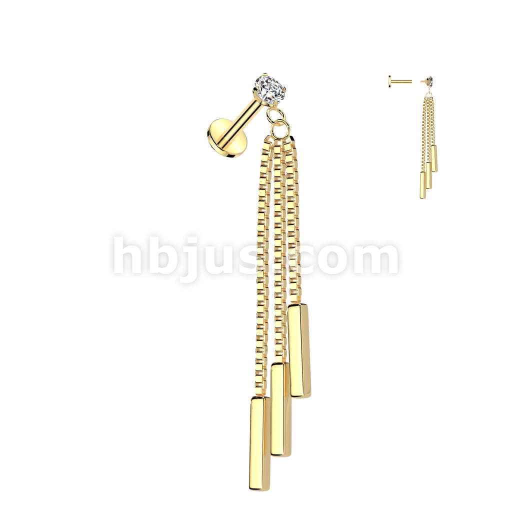 CZ Prong Set Internally Threaded 316L Surgical Steel Labret With Triple Bar Chain Dangle