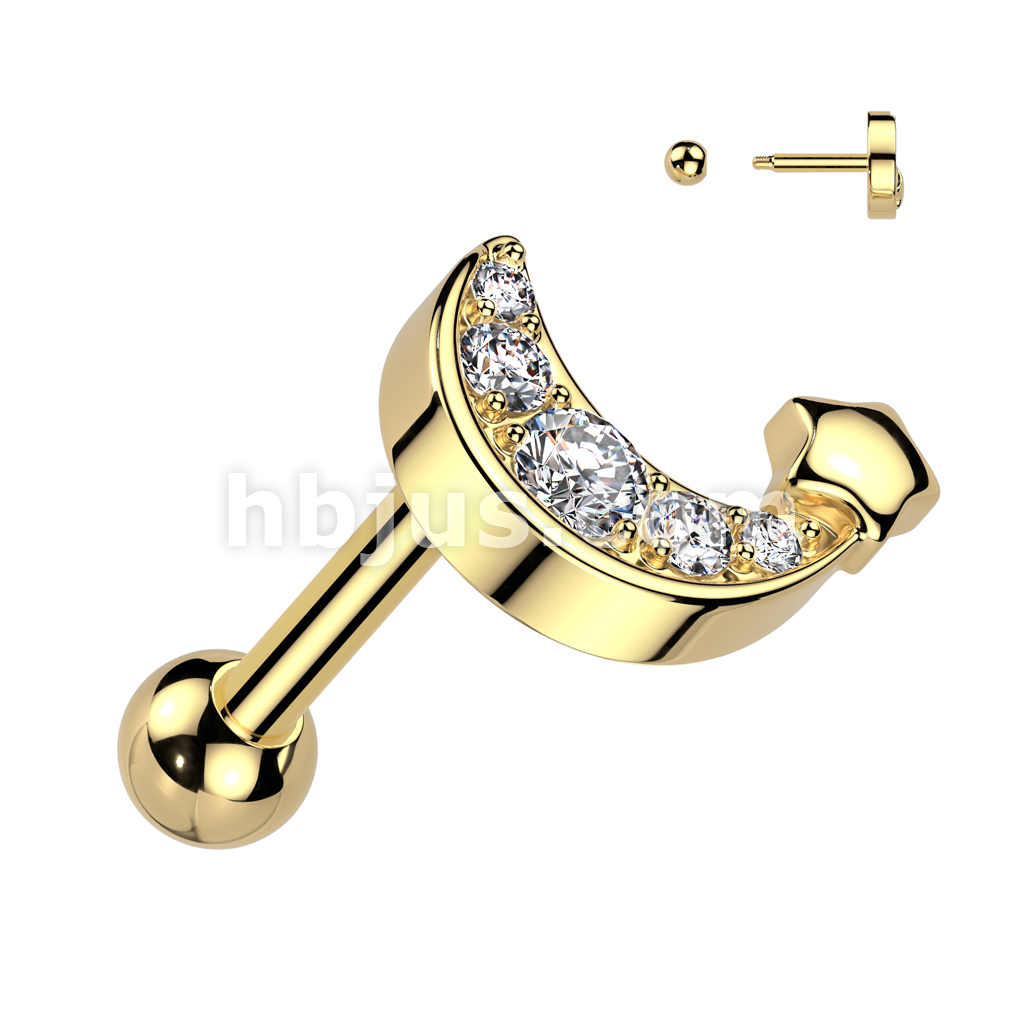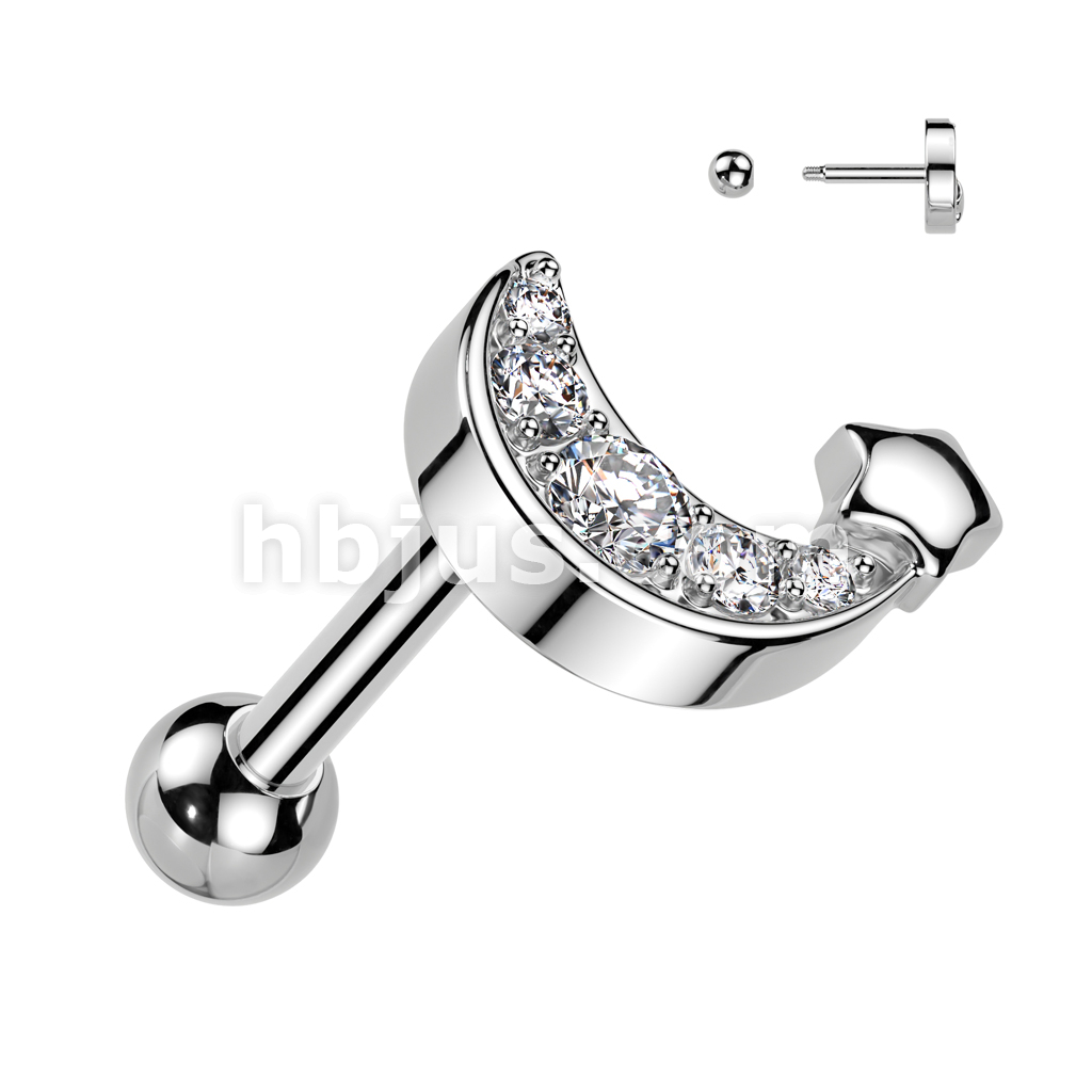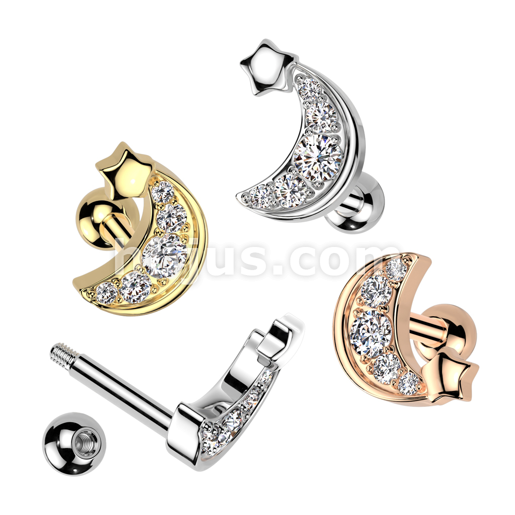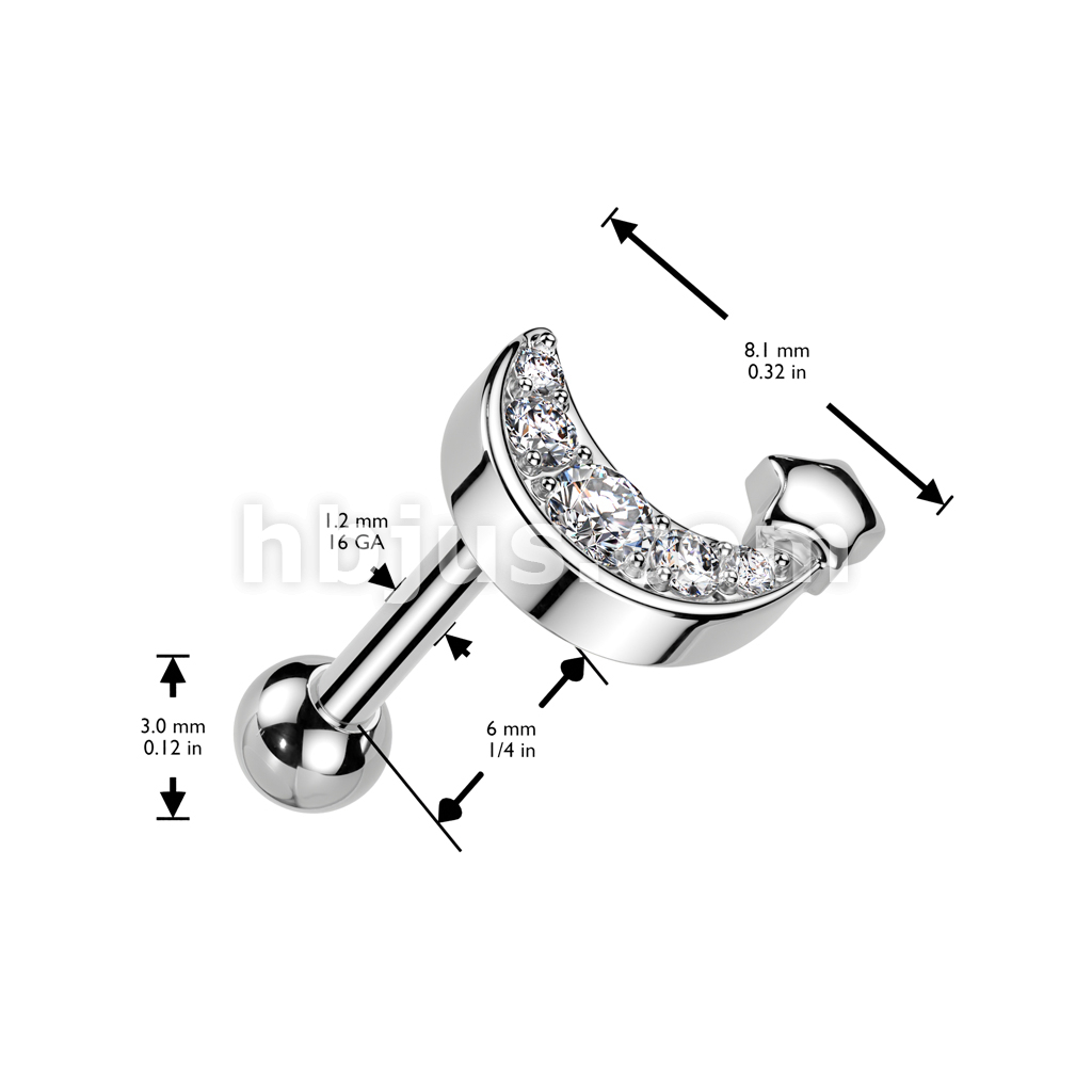 CZ Pave Crescent Moon With Star 316L Surgical Steel Cartilage, Tragus Barbell Stud