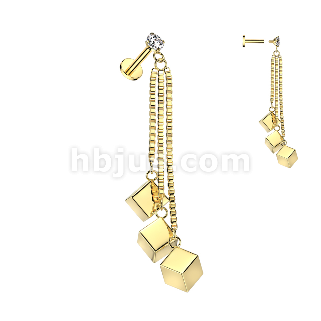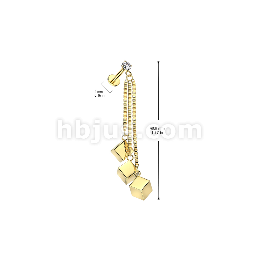 CZ Prong Set Internally Threaded 316L Surgical Steel Labret With Triple Cube Box Chain Dangle