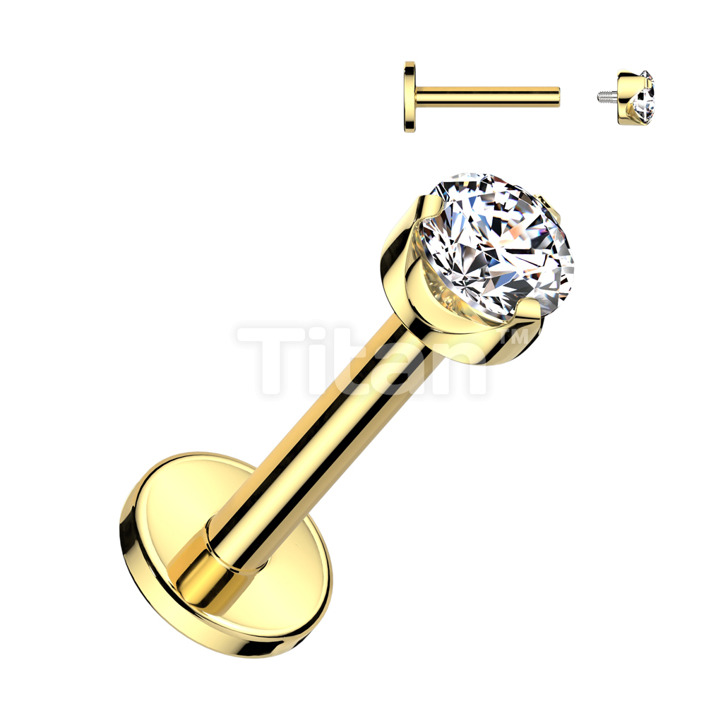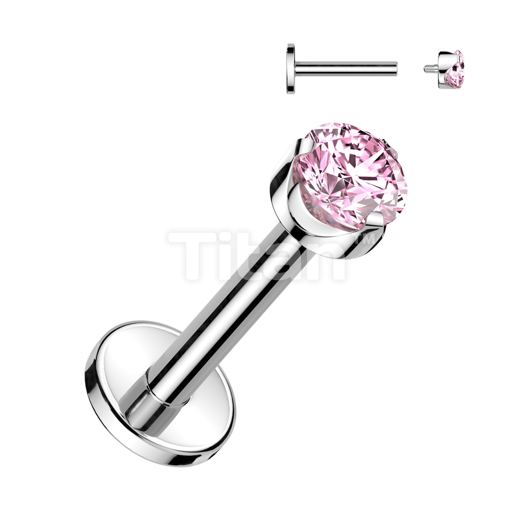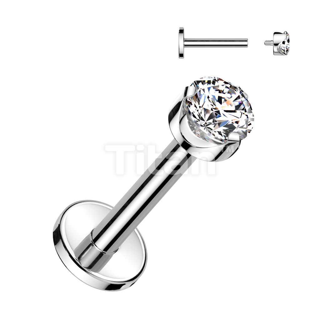 Implant Grade Titanium Internally Threaded Labret With Flat Back Prong Set Round CZ Top