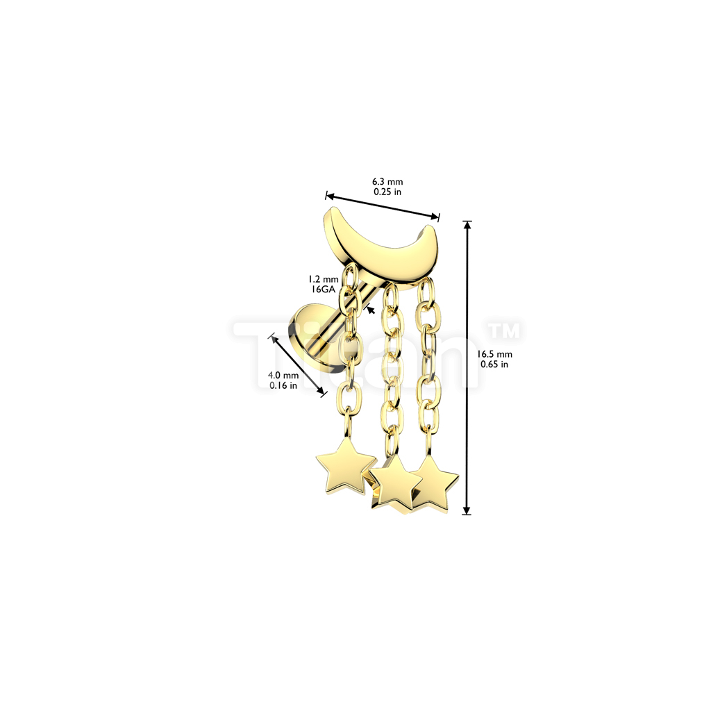 Implant Grade Titanium Internally Threaded Labret Crescent Moon With 3 Star Dangle Top