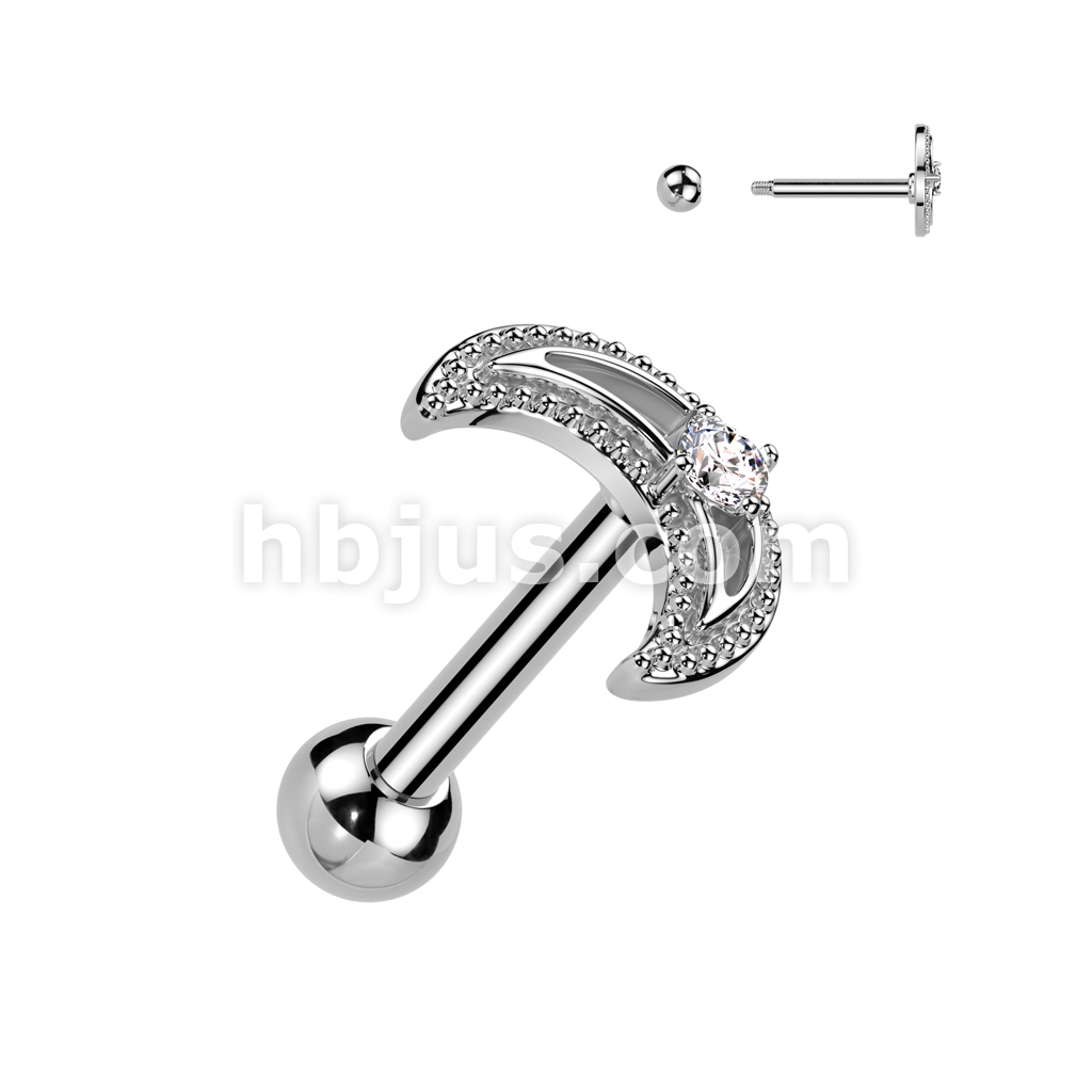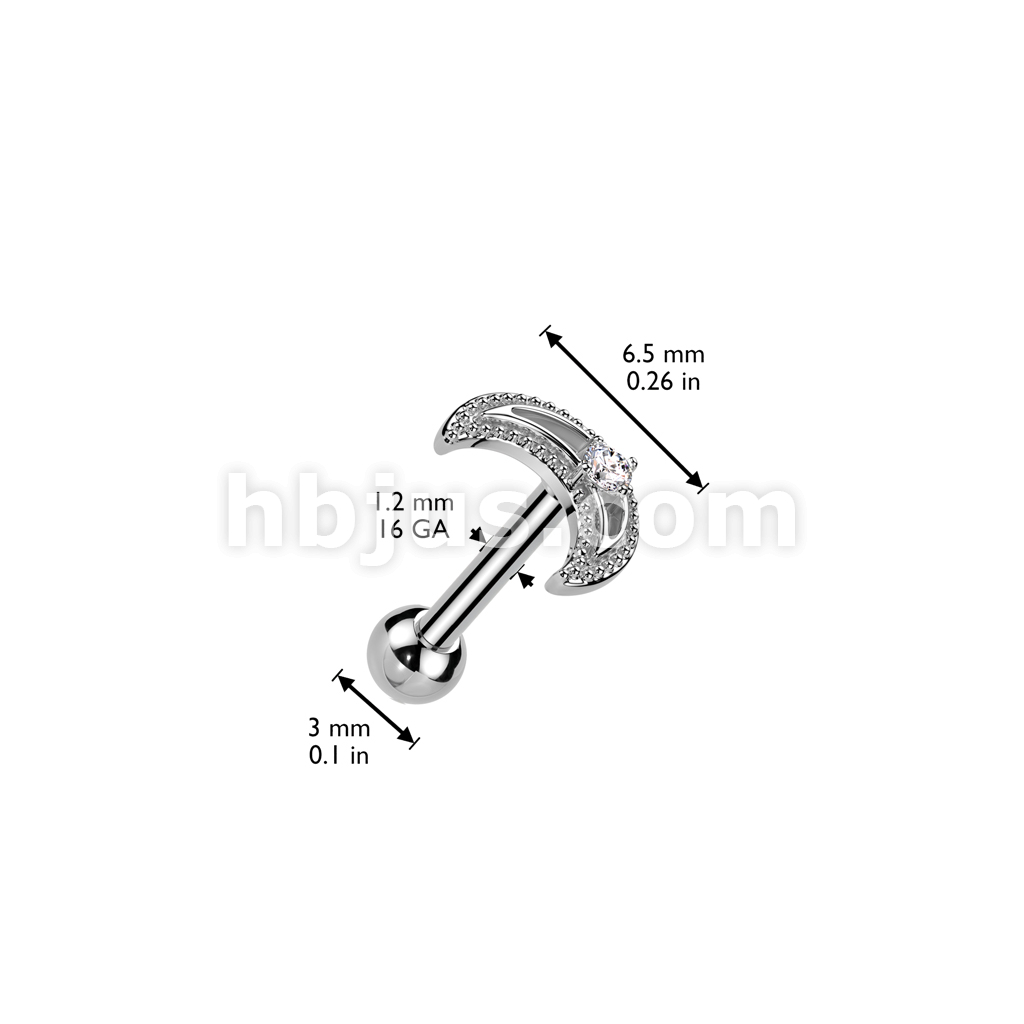 Crescent Moon With CZ Center All 316L Surgical Steel Cartilage, Tragus Barbell Stud