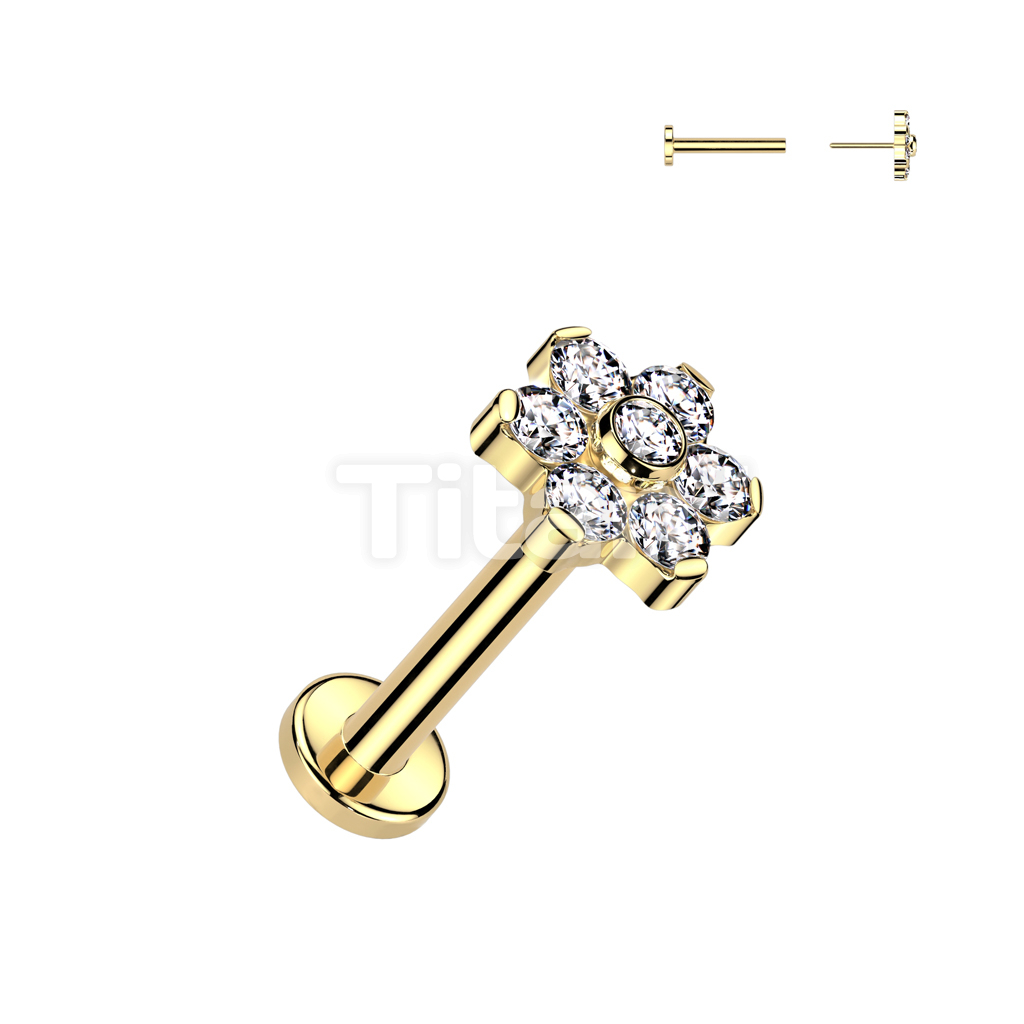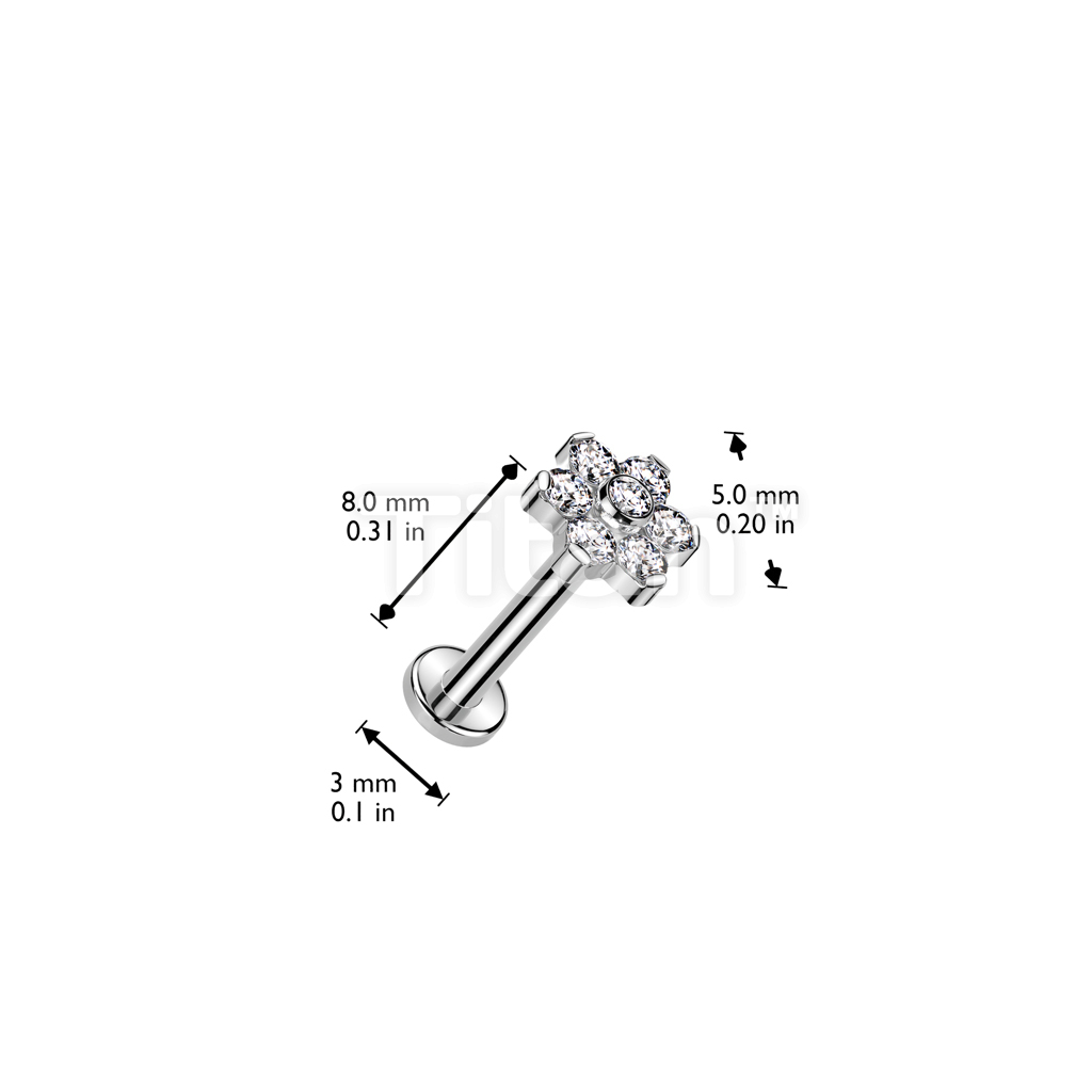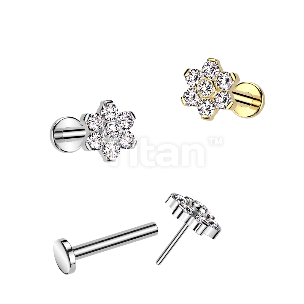 Implant Grade Titanium Threadless Push In Labret With CZ Flower Top and Bezel Set Center and Prong Set Petals