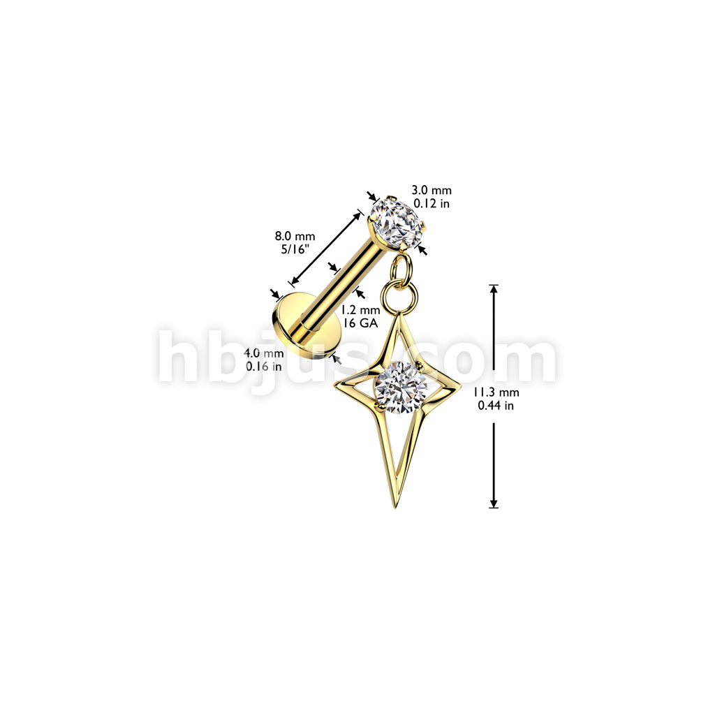 316L Surgical Steel Internally Threaded Round Prong Set CZ Top With CZ Center Hollow Star Cross Dangle Labret Flat Back Stud