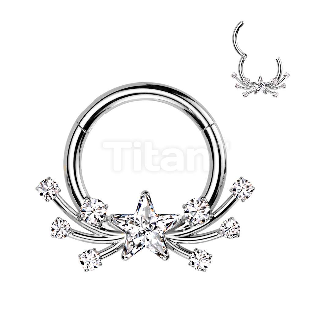 Implant Grade Titanium Hinged Segment Hoop Ring With Forward Facing CZ Star Center and Shooting Stars