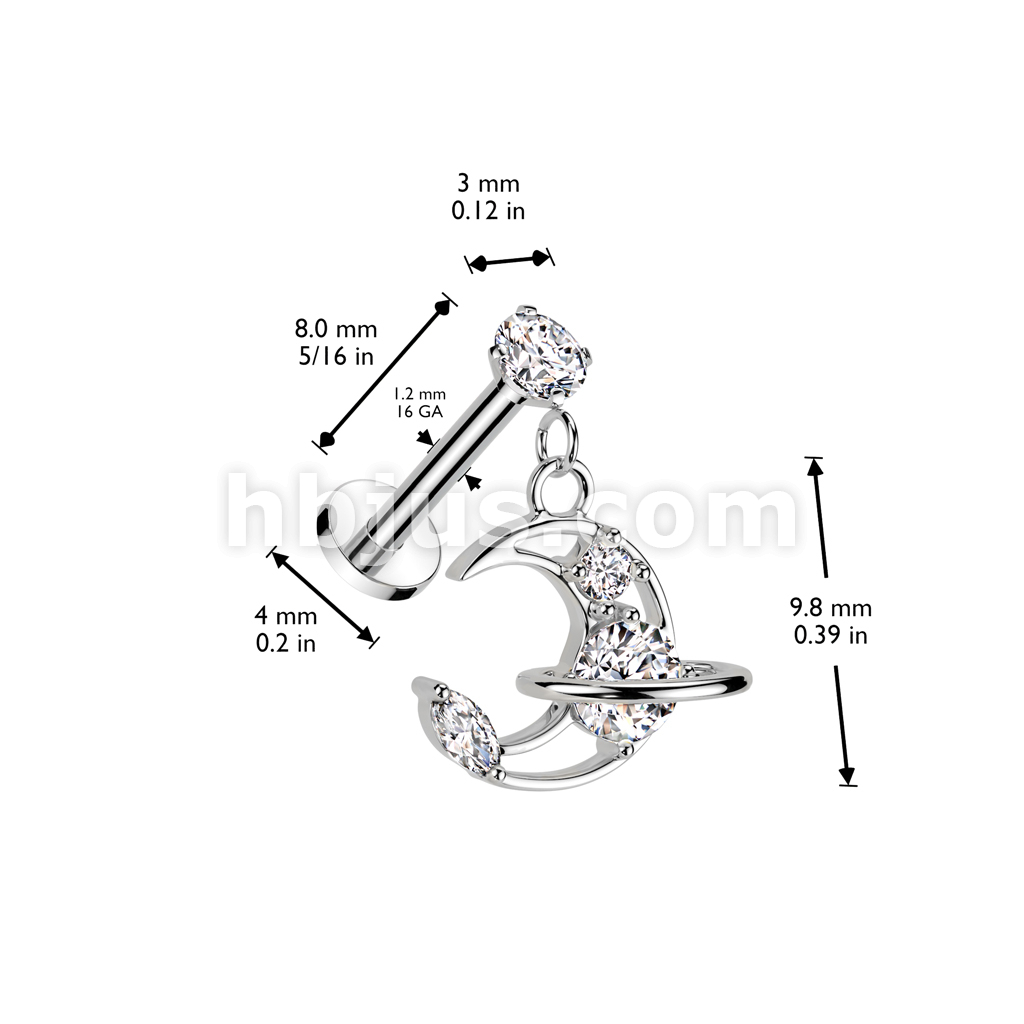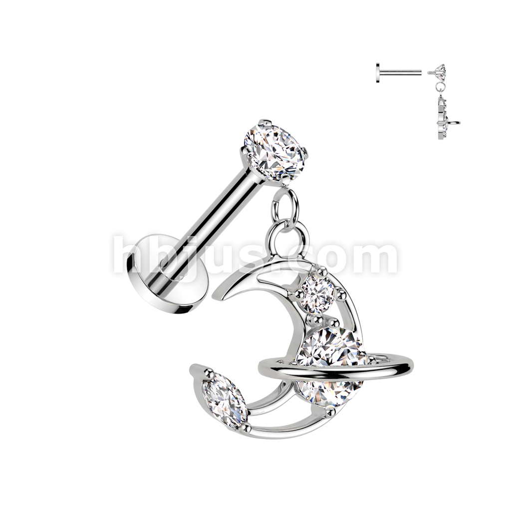 316L Surgical Steel Internally Threaded Round Prong Set CZ Top With CZ Saturn Ring Crescent Moon Dangle Labret Flat Back Stud