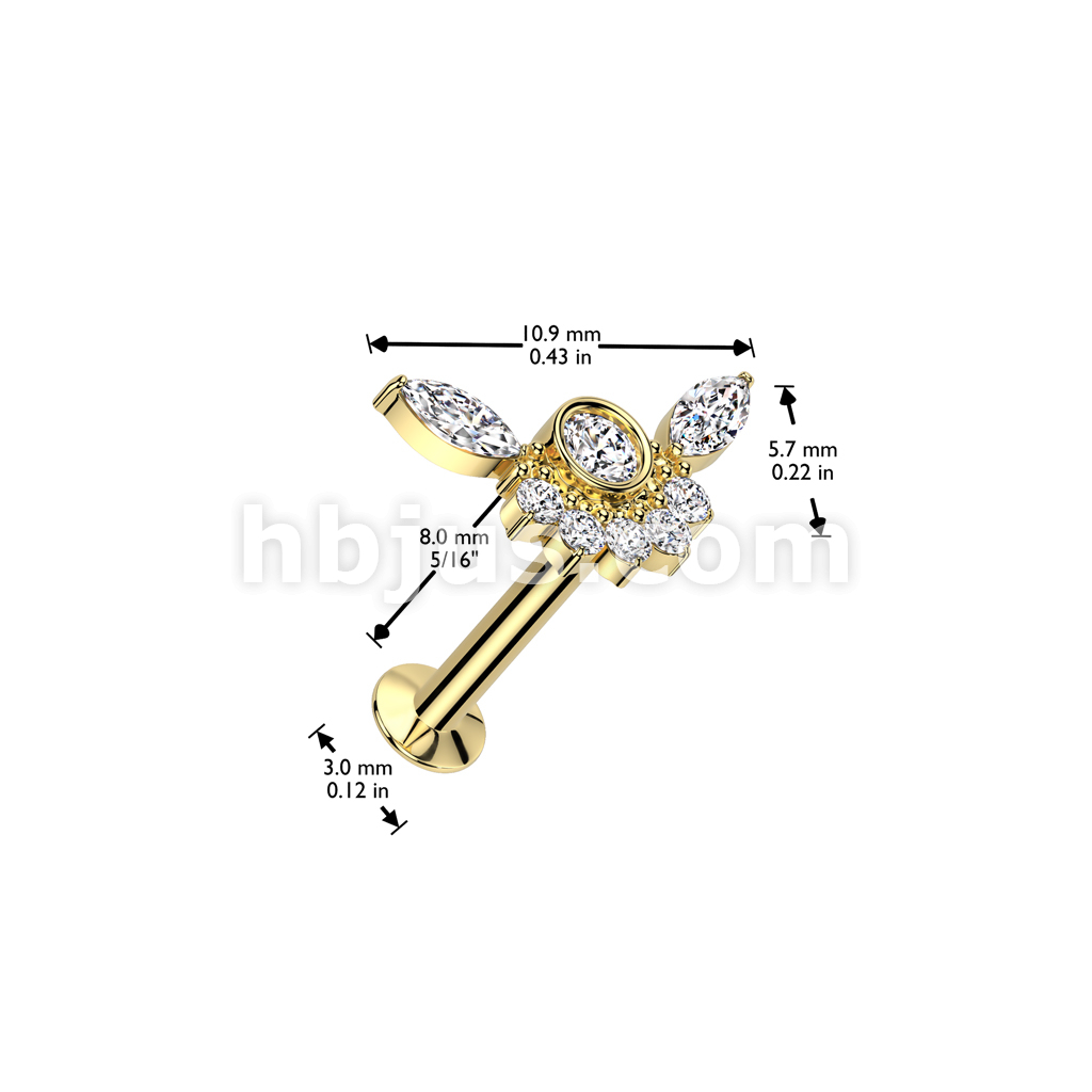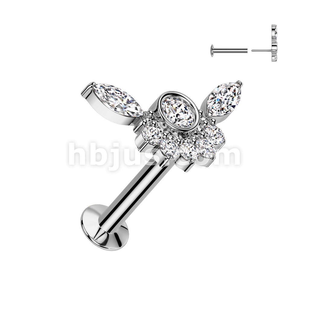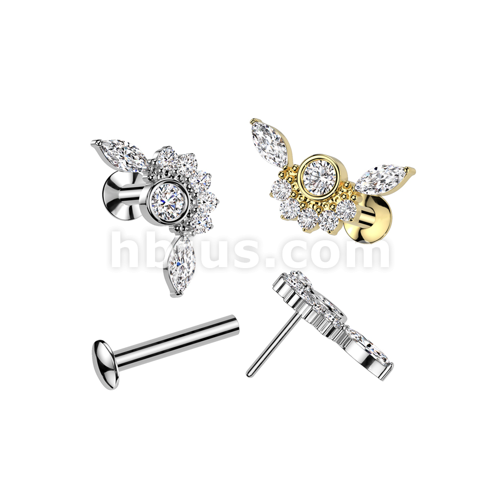 316L Surgical Steel Threadless Push In Flat Back Stud With Convex Back and Bezel Set CZ Center and CZ Cluster Fan Top