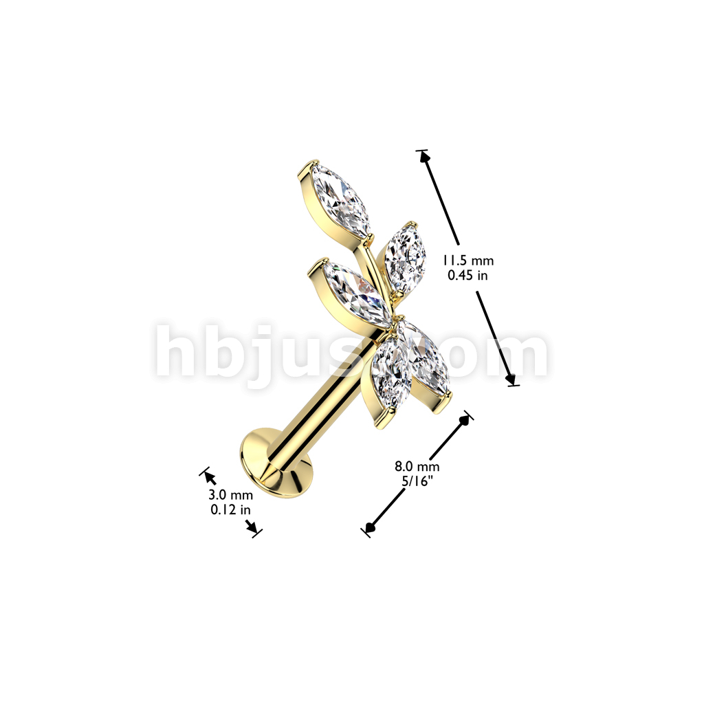 316L Surgical Steel Threadless Push In Flat Back Stud With Convex Back and 5 Marquise CZ Vine Top