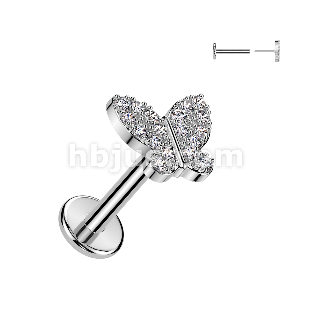316L Surgical Steel Threadless Push In Flat Back Stud With CZ Butterfly Top