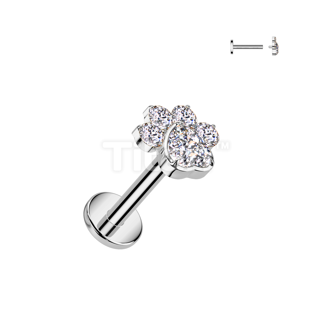 Implant Grade Titanium Internally Threaded Flat Back Stud With CZ Heart And 4 CZ Paw Top