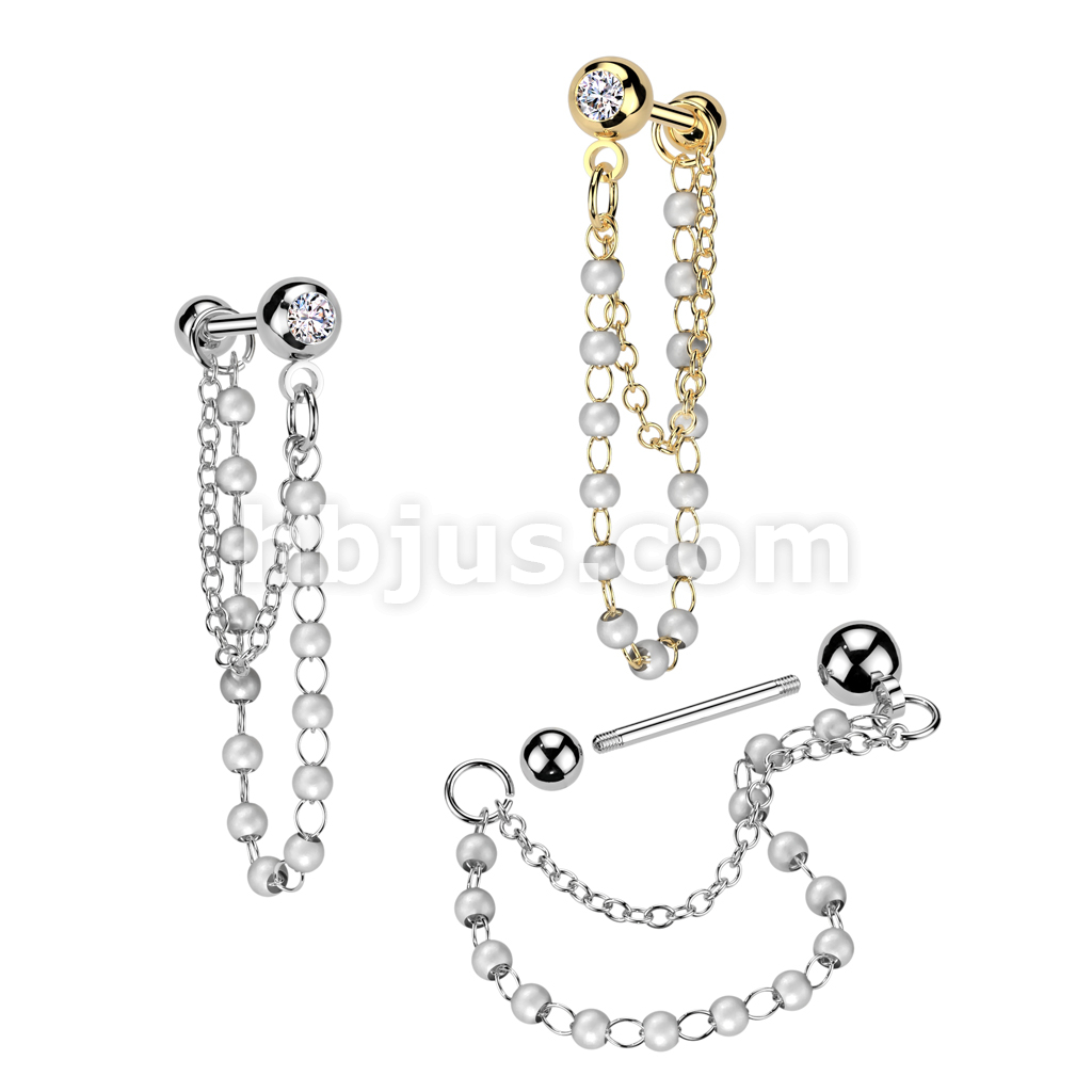 316L Surgical Steel Pressed Fit CZ Tragus, Cartilage Barbell Stud With Pearl Chain Dangle