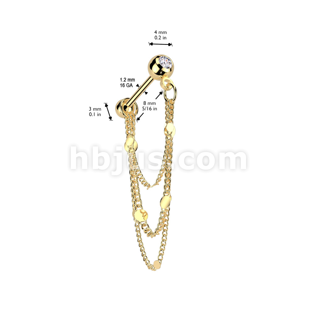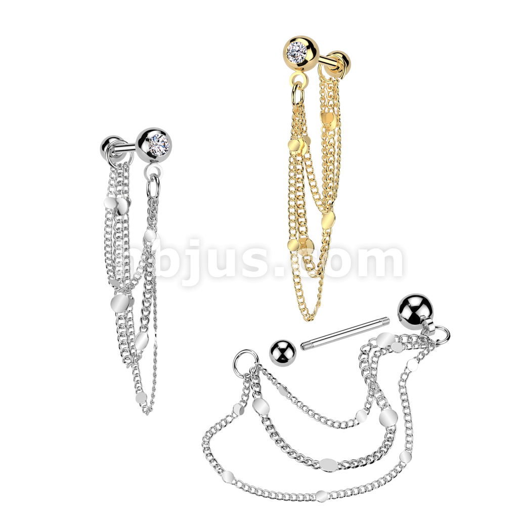 316L Surgical Steel Pressed Fit CZ Tragus, Cartilage Barbell Stud With Round Disc Triple Chain Dangle