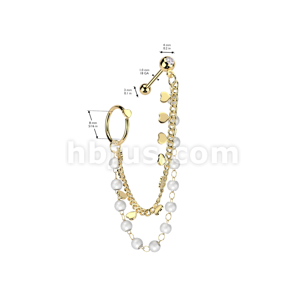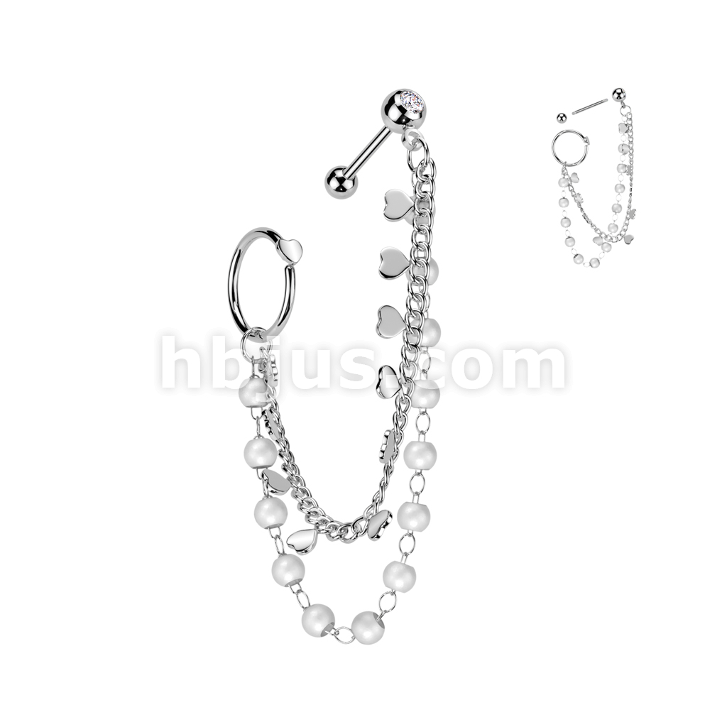 316L Surgical Steel Pressed Fit CZ Tragus, Cartilage Barbell Stud With Pearl And Heart Chain And Heart Hoop