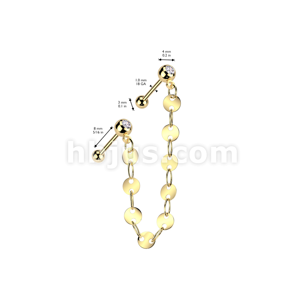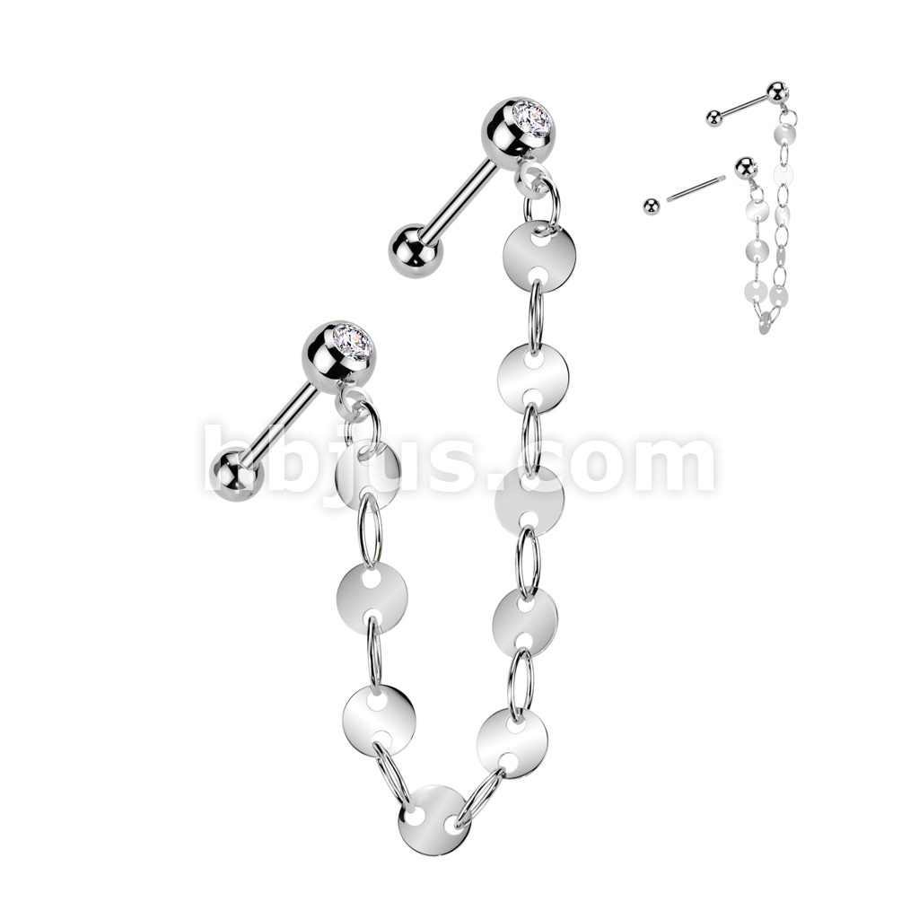 316L Surgical Steel Pressed Fit CZ Tragus, Cartilage Barbell Studs With Flat Disc Link Chain