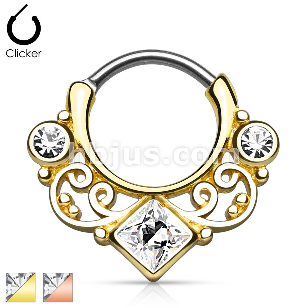 Lace Swirl Gem w/ Square CZ Center Gold IP Septum Clicker
