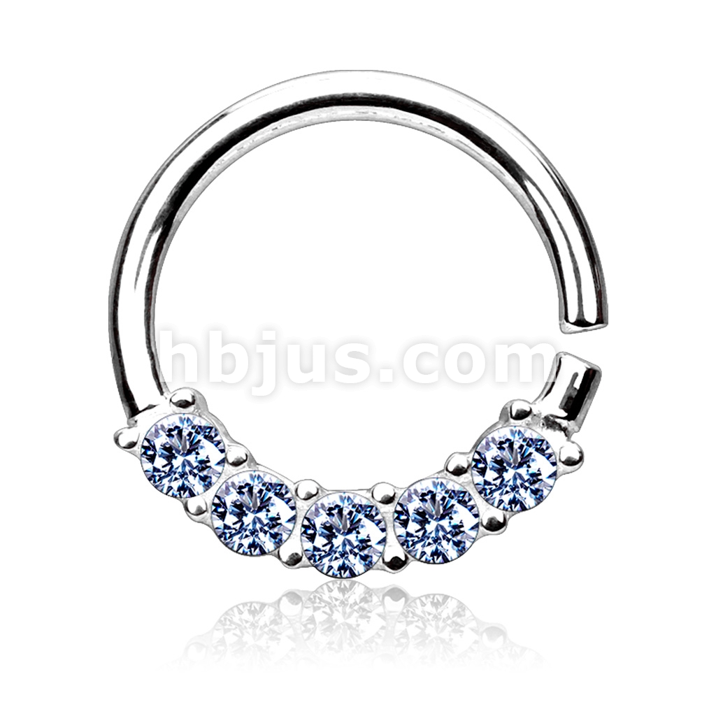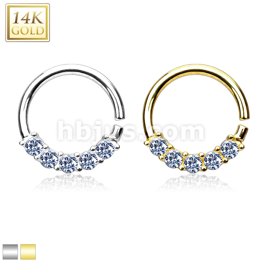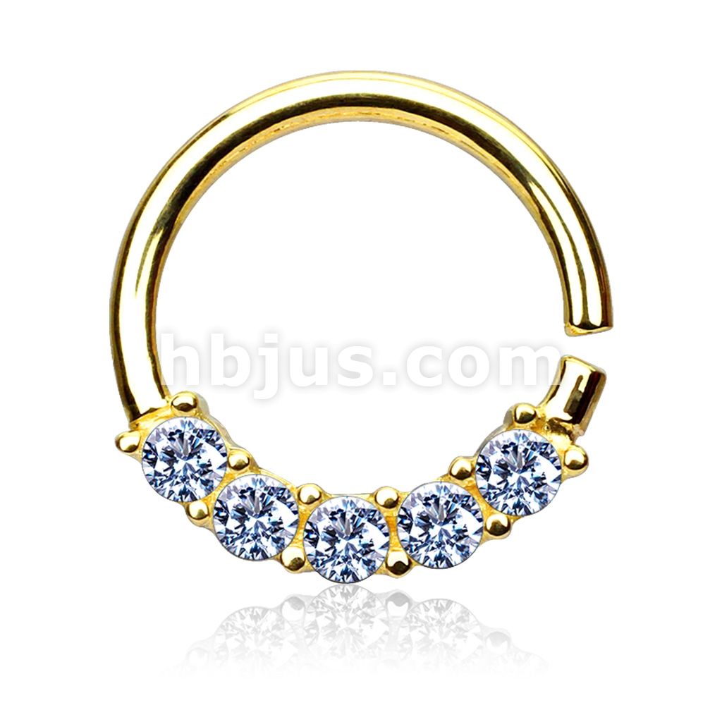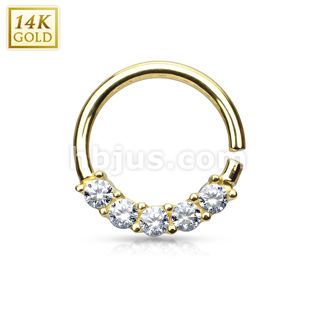 14 Kt. Gold Bendable Round Ring With Five Lined Prong Set CZs for Septum, Cartilage / Tragus