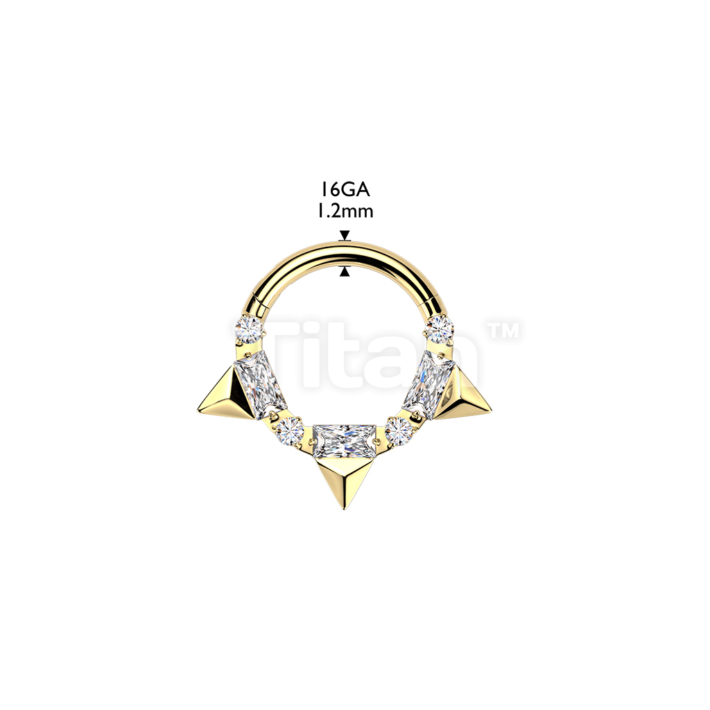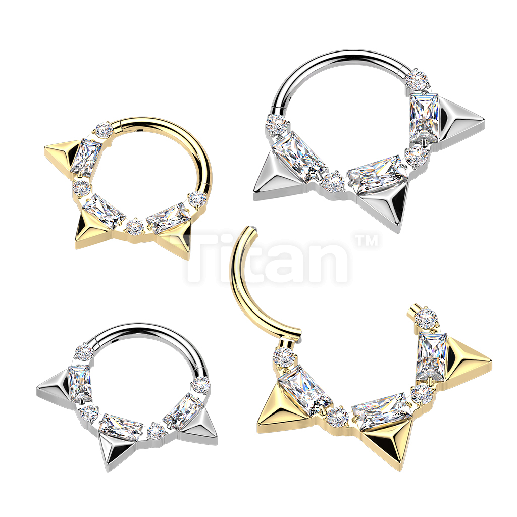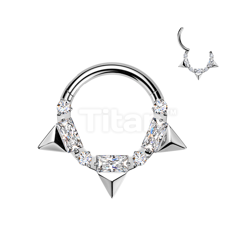 Titanium Hinged Segment Hoop Ring With Triple Spikes And Baguette and Round CZ