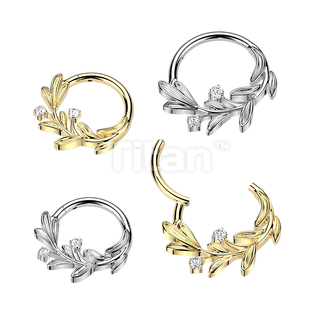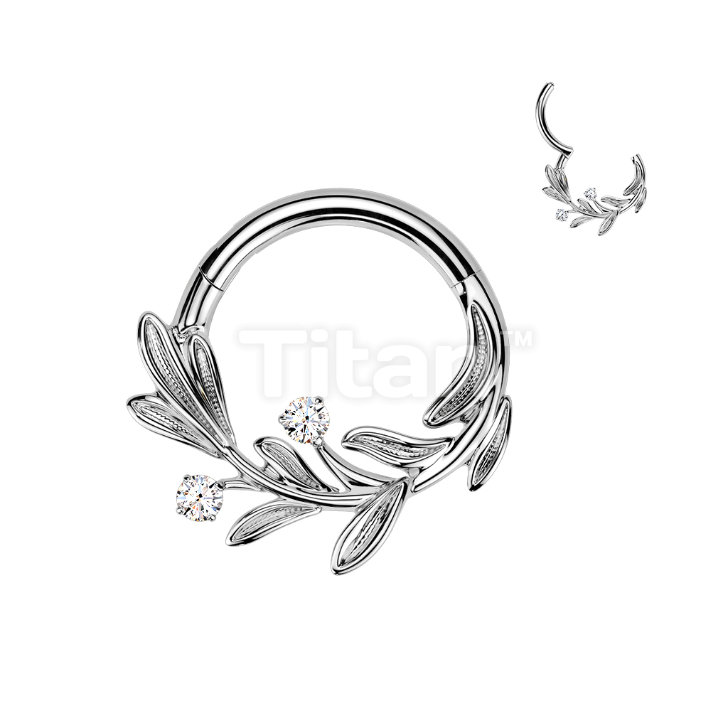 Titanium Hinged Segment Hoop Ring With Olive Leaf and CZ