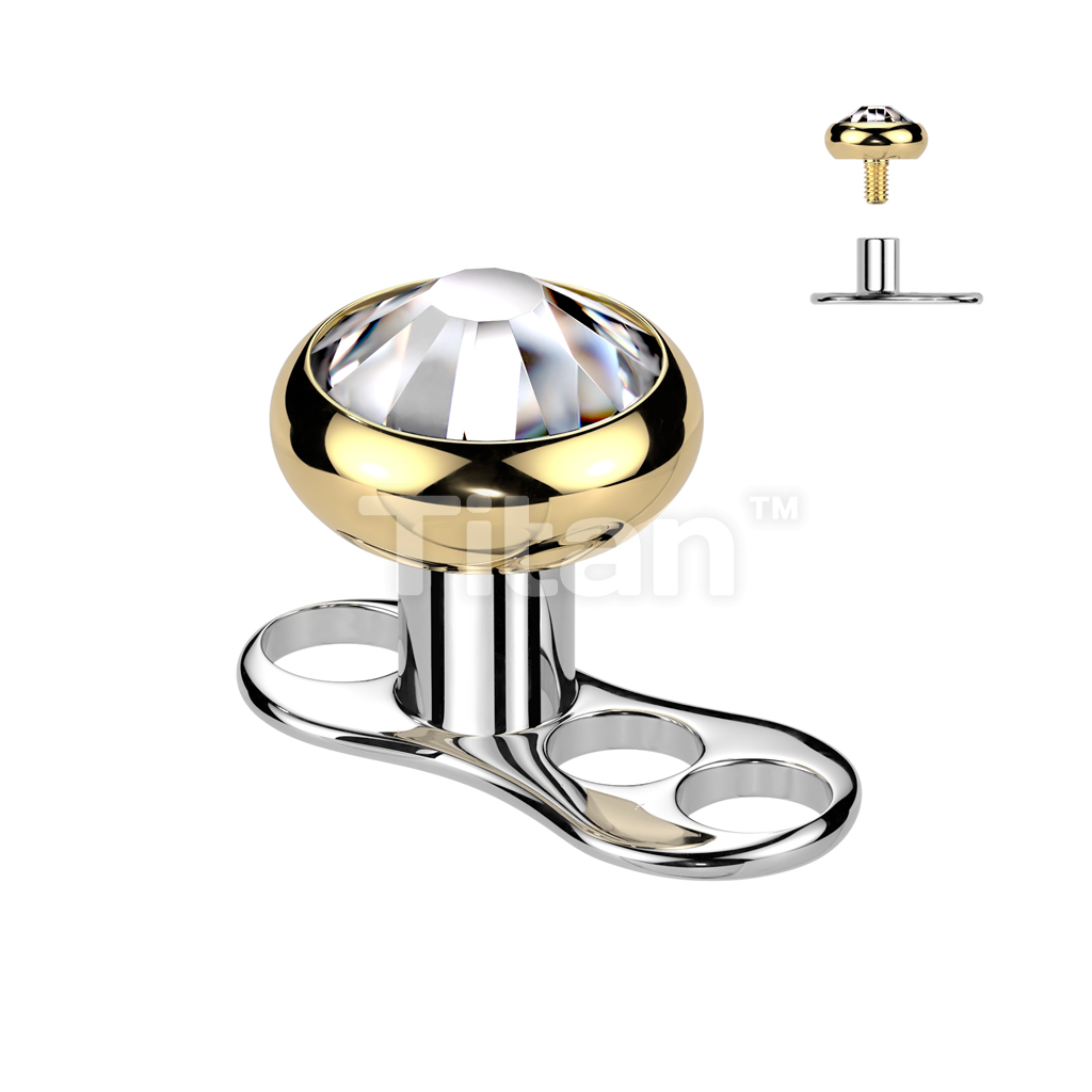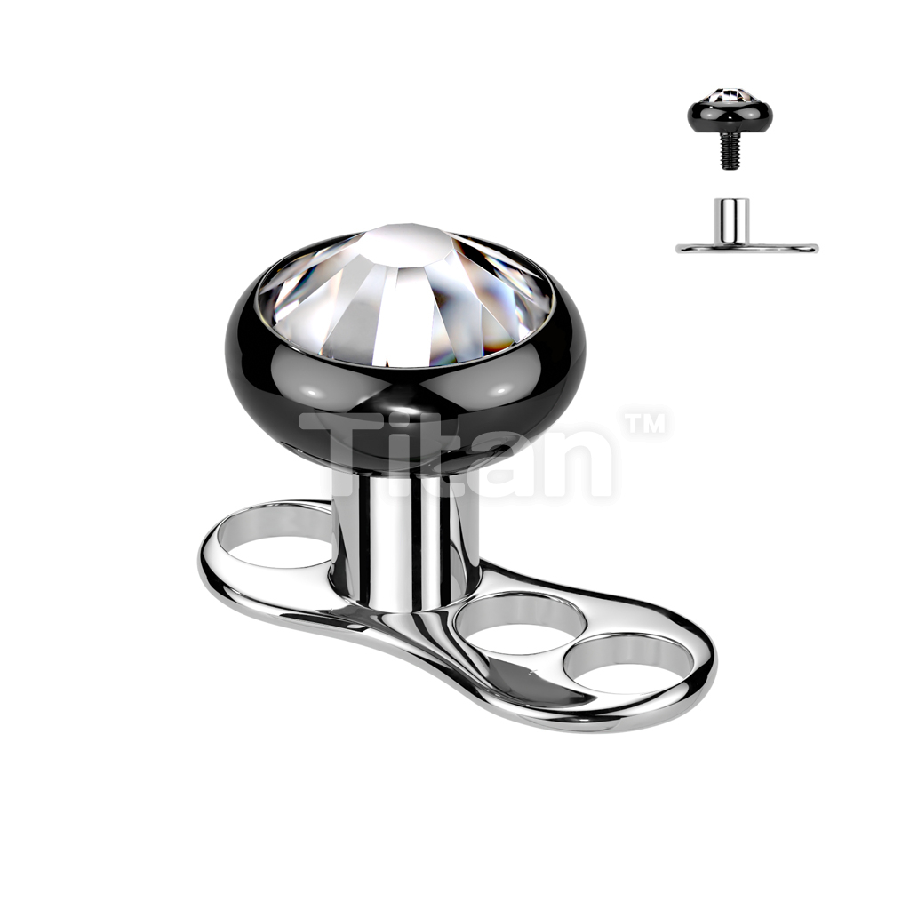 Implant Grade Titanium Internally Threaded 3 Hole Dermal Anchors With 2mm Rise and Titanium Flat Round Bezel Set Crystal Top