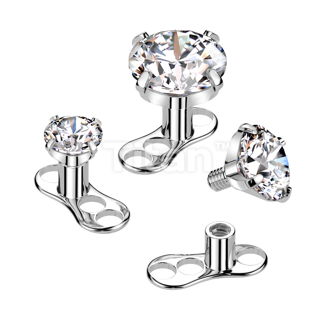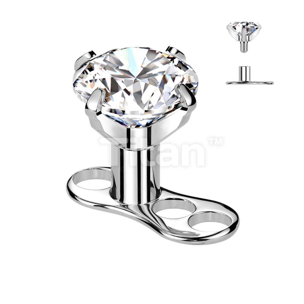 Implant Grade Titanium Internally Threaded 3 Hole Dermal Anchor With 2mm Rise and Titanium Prong Set CZ Top
