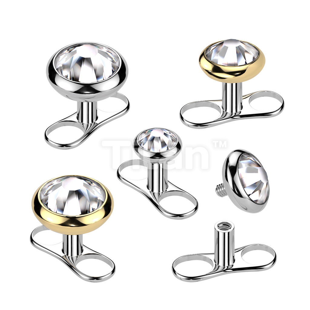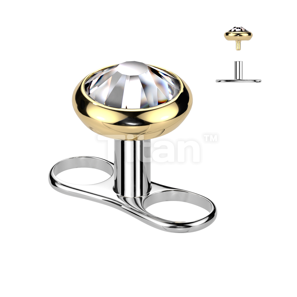Implant Grade Titanium Internally Threaded 2 Hole Dermal Anchor With 2.5mm Rise and Titanium Flat Bezel Set Crystal Top