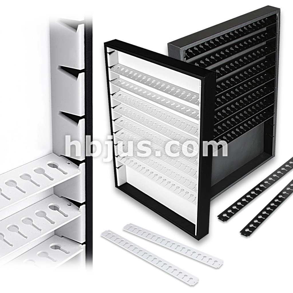 With 18 holes in a each rack, this 10 rack display board can hold as much as 180 barbells, eyebrows, or navel rings. With its removable rack function, there are no long navel rings that cannot be displayed in this rack display board. This board fits directly into the FFS-01 and FFS-02 display. |