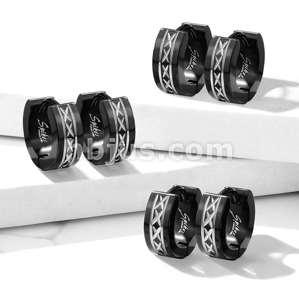 Pair of 316L Stainless Steel Black Hinged Hoop Wide Earrings with Dia-Cut and Grooved Center